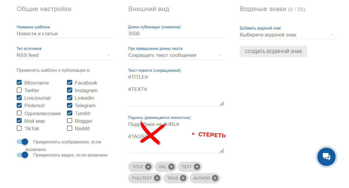Затем необходимо настроить приёмники публикуемых материалов. Некоторые из них называют опцию “Прикрепить ссылку к посту” и опцию можно просто включить или выключить (нам нужно, как вы уже догадались, выключить), а в других (к примеру, в параметрах получателя в Telegram) опция "Добавлять ссылку" имеет возможность выбора варианта, нам нужен вариант "нет" или "не добавлять".