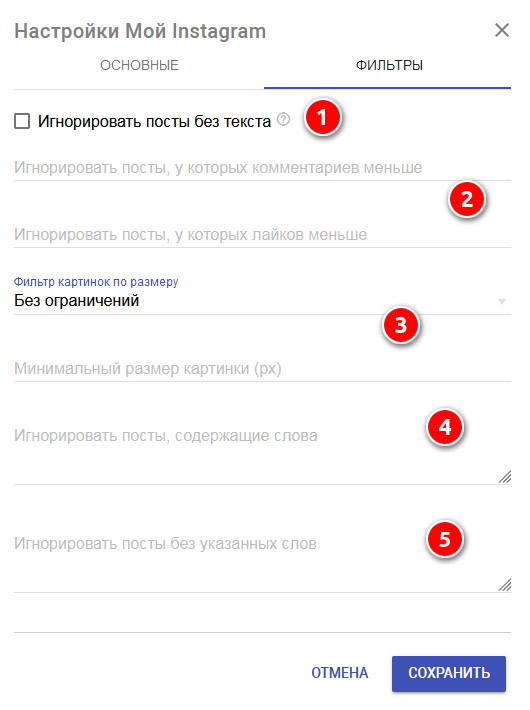 2, 3. Здесь вы можете ввести минимальное число комментариев/лайков. Публикации, не набравшие данное количество комментариев/лайков, будут игнорироваться. Данная функция позволяет публиковать только популярные посты из ленты.