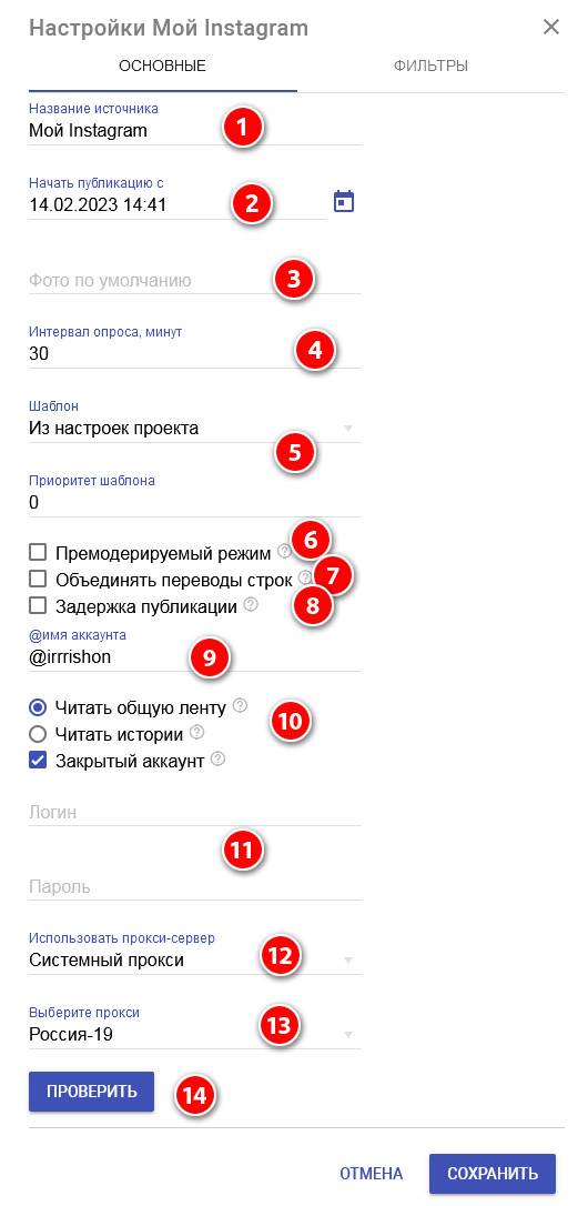 10, 11. Выберите, откуда будем брать публикации: из общей ленты или из Историй. Если мы намерены публиковать из аккаунта, закрытого для общего обзора, то ниже необходимо ввести пароль и логин.