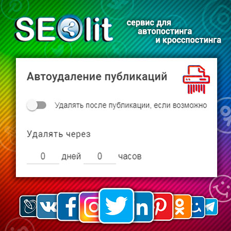 Сервис SEOlit расширяет свой функционал. Автоматическое удаление постов — ещё одна полезная настройка постинга. Устаревший пост не останется в ленте навсегда, а будет удалён через некоторое время. По сути автоудаление постов представляет собой противоположность отложенному постингу. С помощью SEOlit можно планировать не только публикацию поста, но и его удаление. Работать с расписанием постинга и планировать публикации станет ещё удобнее. Автоудаление значительно упростит работу с контент-планом и будет так же эффективен, как автопостинг, кросспостинг и отложенный постинг, реализованные на SEOlit.