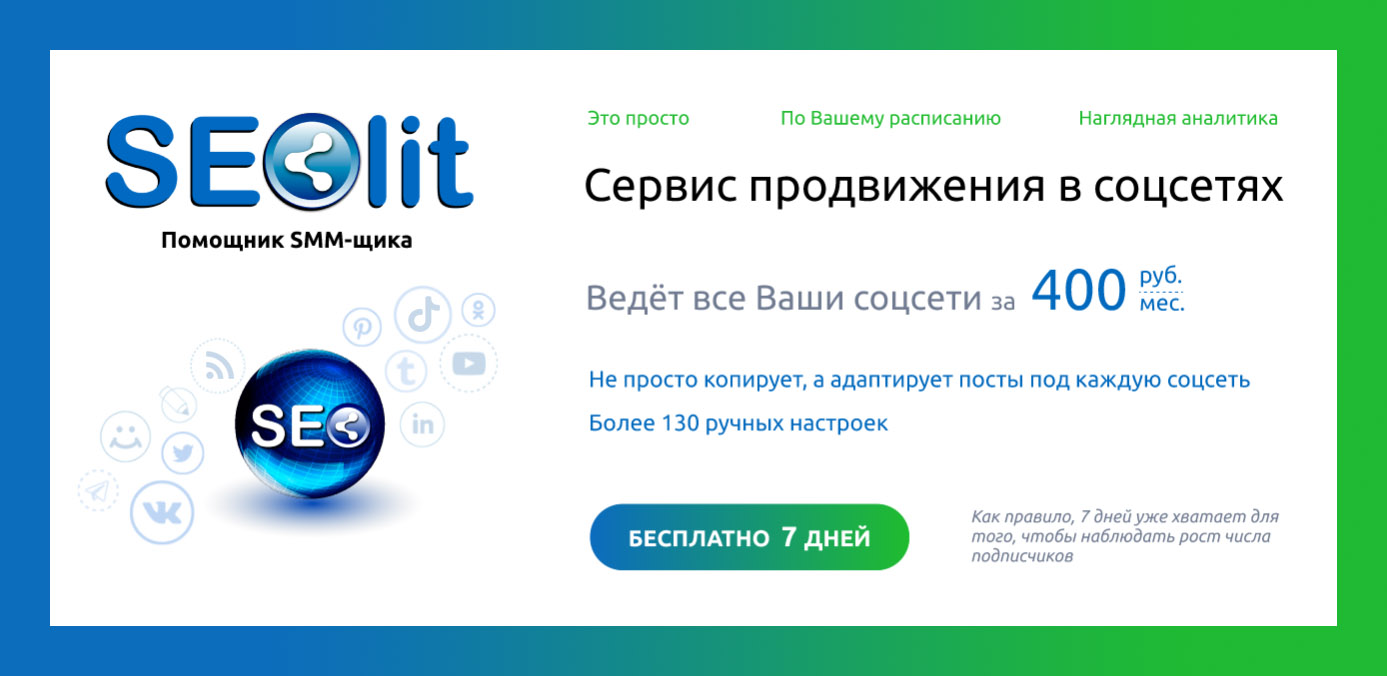 Онлайн-сервис SEOlit выполняет настройку автопостинга, кросспостинга и отложенного постинга. При автопостинге вся информация с внешнего сайта будет публиковаться в соцсетях, что очень полезно для интернет-магазинов и владельцев тематических сайтов. SEOlit считывает обновления из RSS/Atom-ленты сайта и публикует её в соцсети. Для автопостинга доступны 11 соцсетей: ВКонтакте, LiveJournal, Мой Мир, Facebook*, Telegram, Одноклассники, Twitter, LinkedIn, Tumblr, Pinterest, Instagram*. Автопостинг можно настроить в любую из них или даже во все сразу.