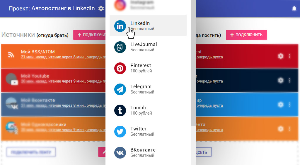 При необходимости можно подключить несколько соцсетей-приёмников. SEOlit настроит автопостинг в 11 соцсетей: LinkedIn, Telegram, ВКонтакте, Tumblr, Instagram*, Twitter, Facebook*, LiveJournal, Pinterest, Одноклассники, Мой Мир. Это подключение нужно обязательно настроить до привязки ленты-источника.