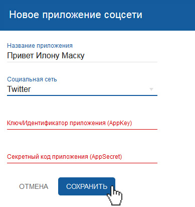 Укажите AppKey и AppSecret, скопированные из вашего приложения в Твиттере. Выберите соцсеть Twitter. Название приложению можно дать любое, какое вам нравится. Сохраните приложение.