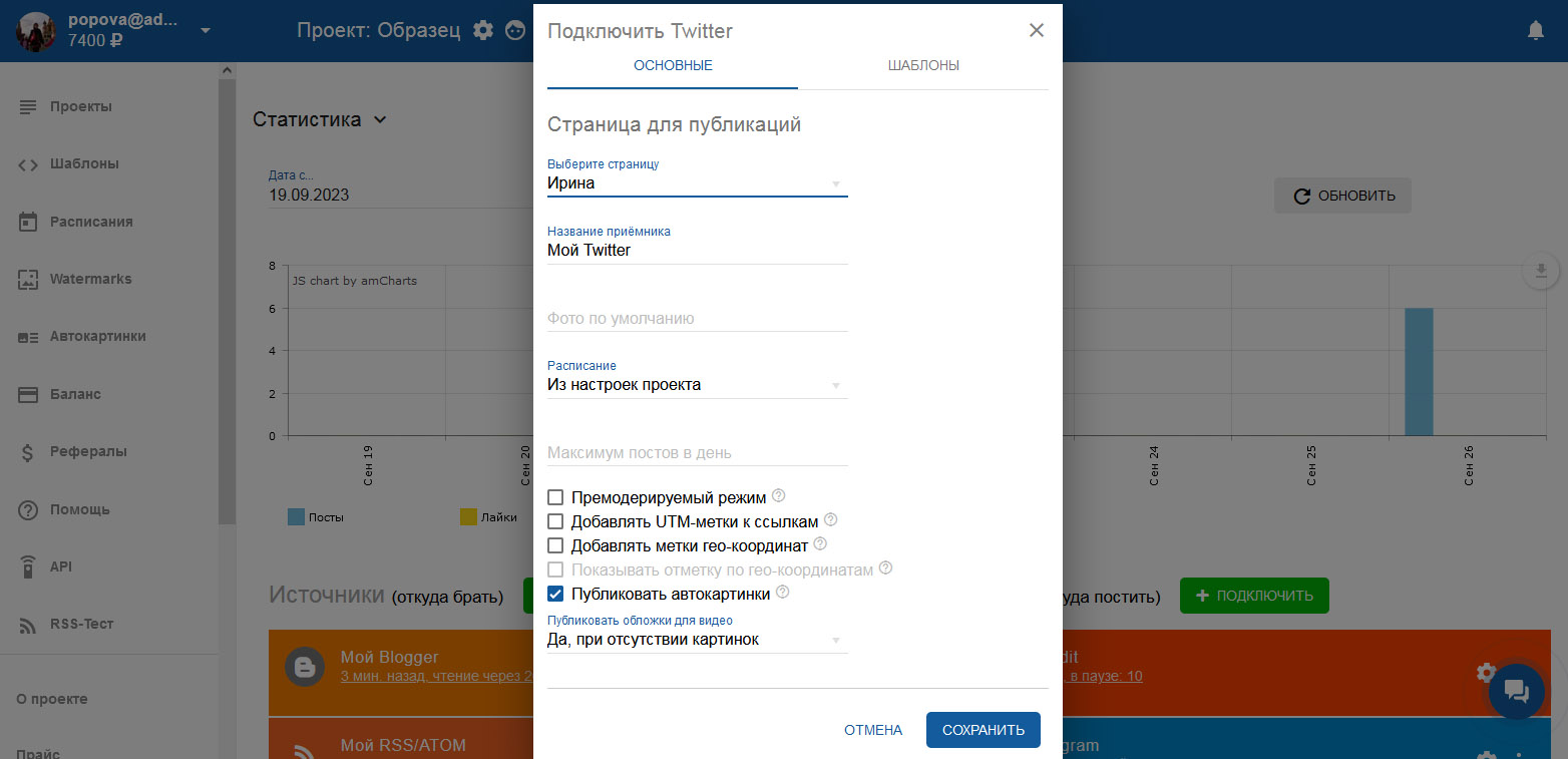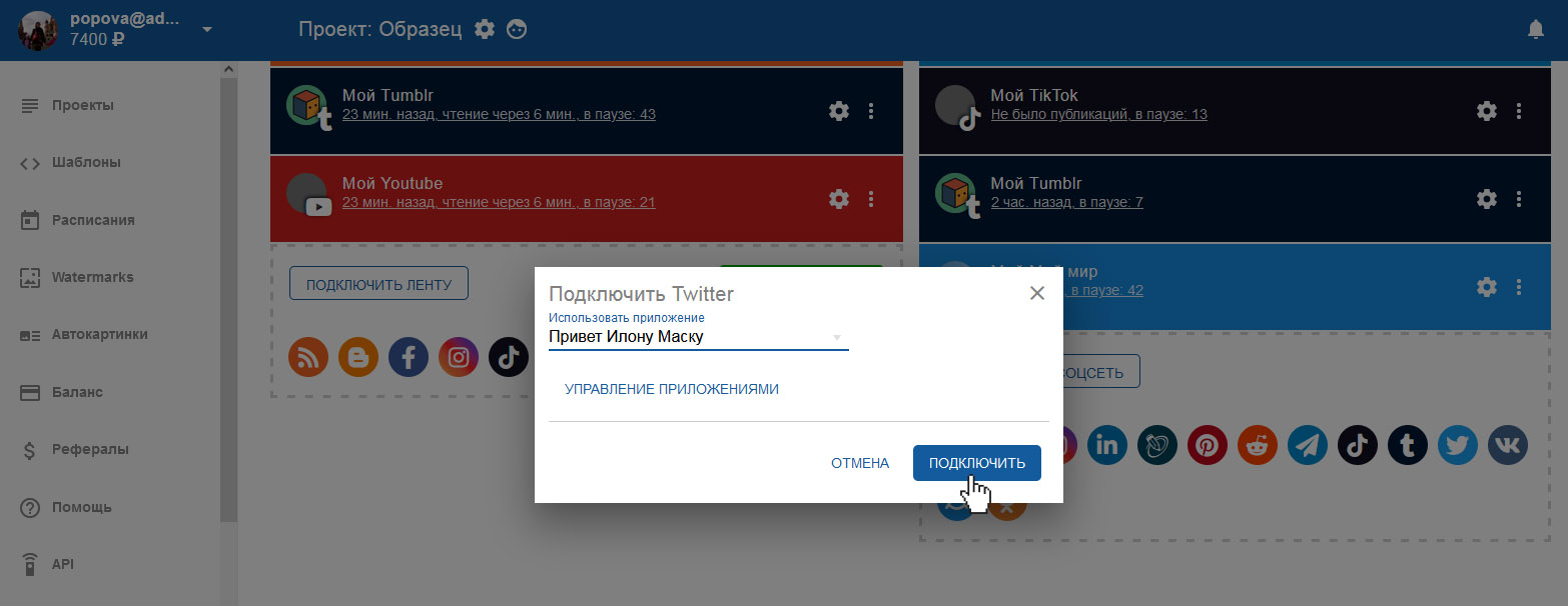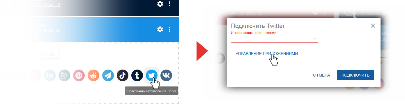 ВАЖНО! Если у вас твиттер доступен только через proxy/VPN, необходимо, чтобы эти инструменты были включены, т.к. в процессе подключения аккаунта необходимо будет пройти авторизацию в Твиттере.