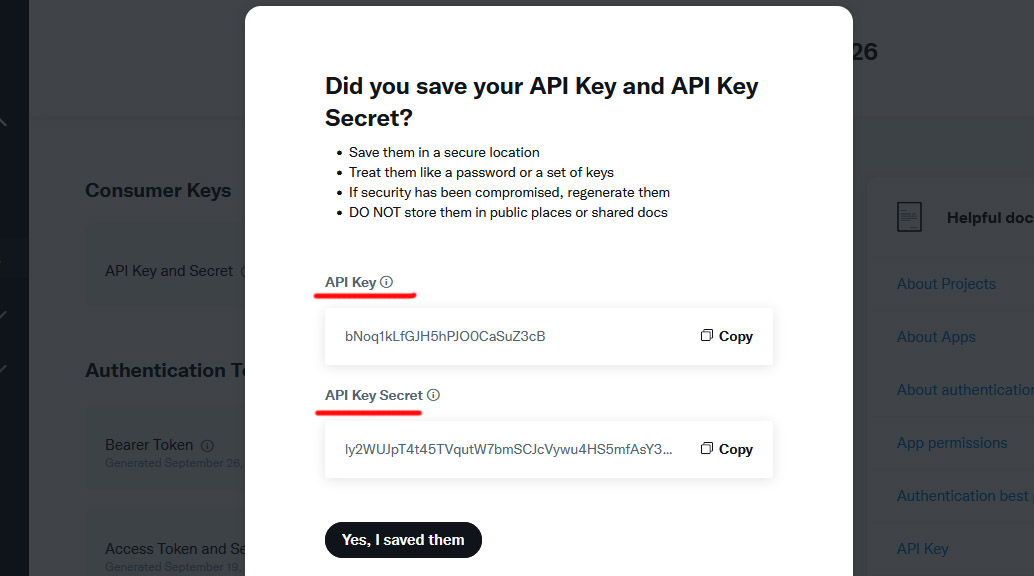 Скопируем два поля Key и Secret, эти строчки мы будем подставлять в соответствующие поля на Сеолите.