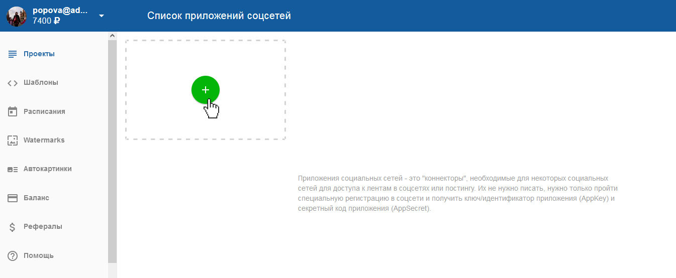 Откроется список приложений. Нажмите +, чтобы подключить своё приложение.