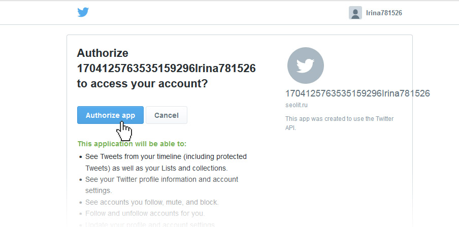 Разрешаем СЕОлиту работать с вашим аккаунтом в Твиттере.