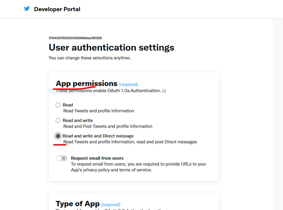 Откроется отдельная страница. Здесь в блоке «App permissions» выберите «Read and write and Direct message»
