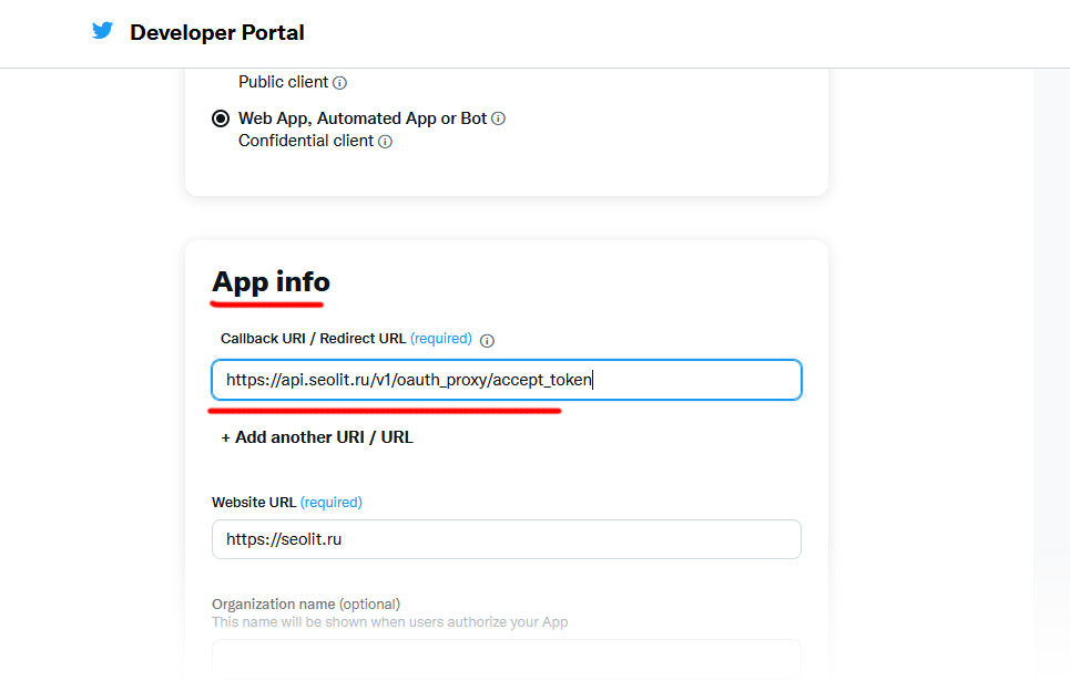 В блоке «App info» в пункте «Callback URI / Redirect URL» внесите значение https://api.seolit.ru/v1/oauth_proxy/accept_token