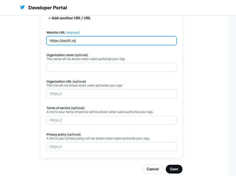 В пункте «Website URL» укажите наш или ваш сайт - на работу приложения этот пункт не повлияет.