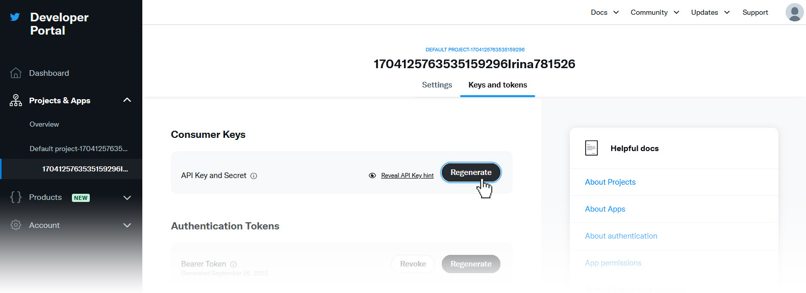 Теперь перейдите в раздел «Keys and tokens». Здесь в первом блоке «Consumer Keys» создаём токен.
