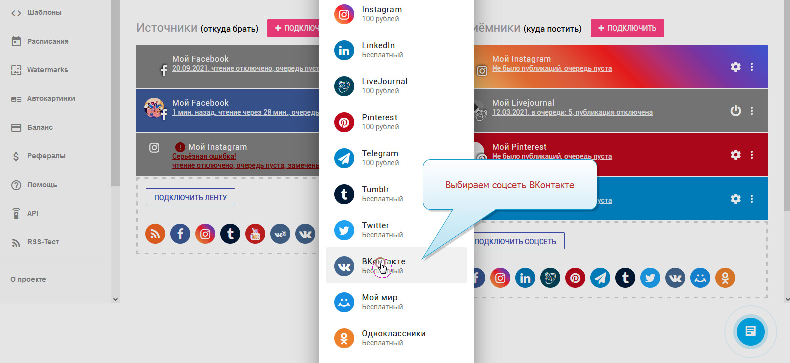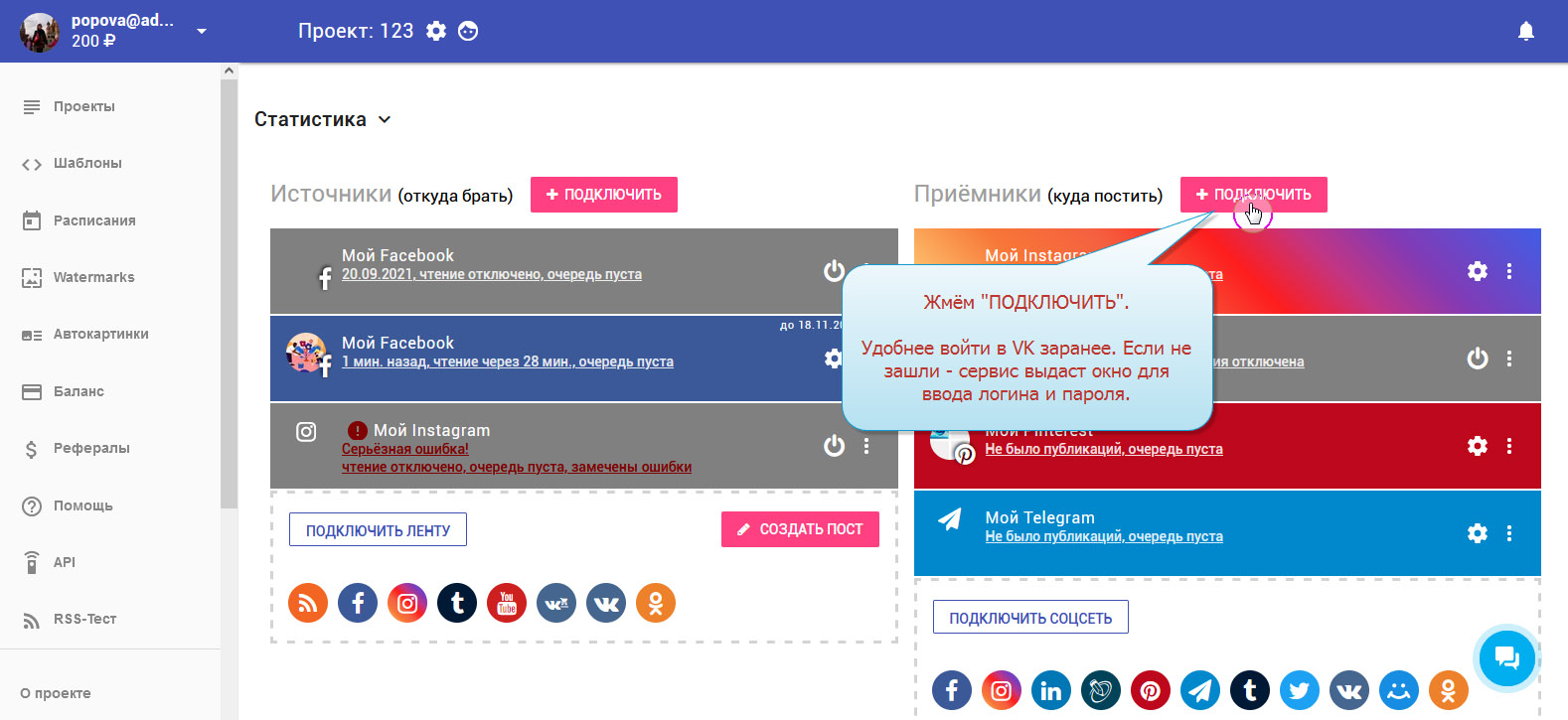 3. В колонке "Приёмники" нажимаем "ПОДКЛЮЧИТЬ". Будет удобнее заранее зайти в свой аккаунт ВК. Или вводим логин-пароль в окне авторизации.