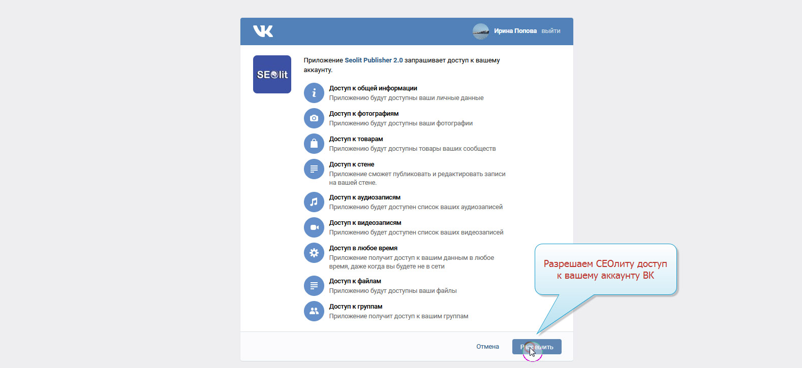 5. Даём СЕОлиту разрешение на доступ к своему аккаунту ВК.