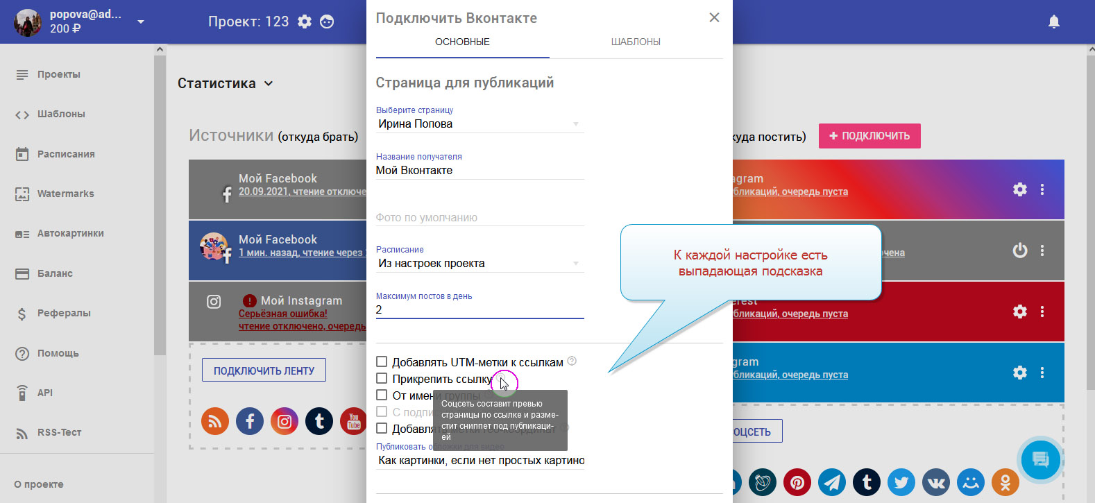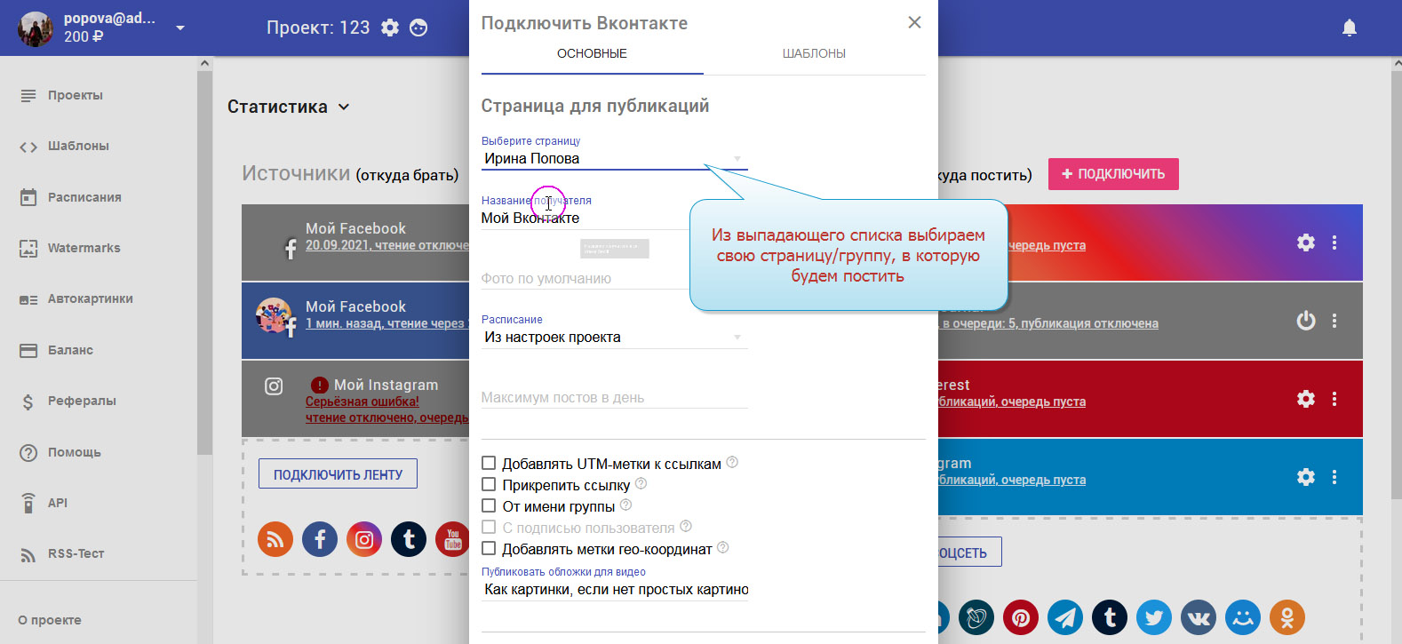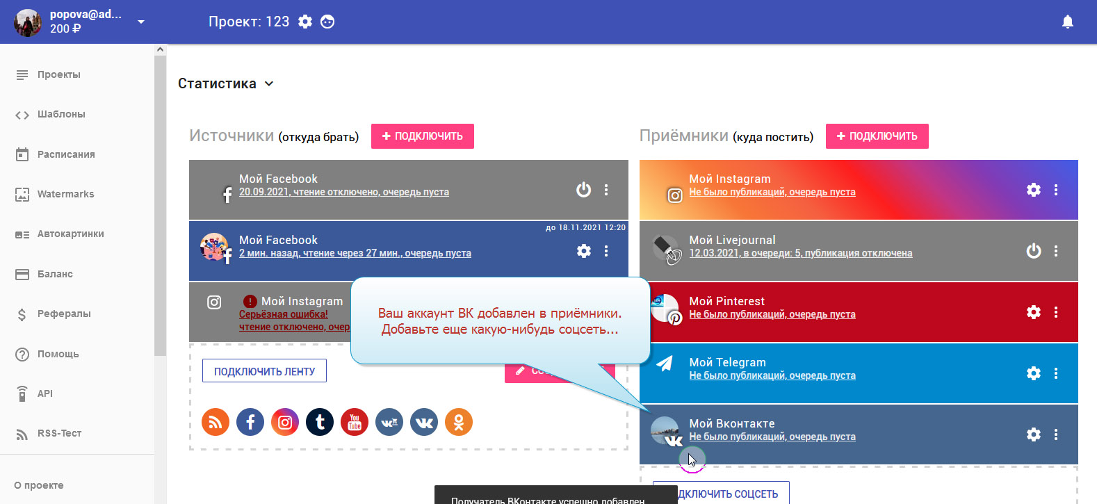 13. На этом добавление соцсети ВКонтакте завершено. В колонке с приёмниками вы можете увидеть свой добавленный аккаунт.