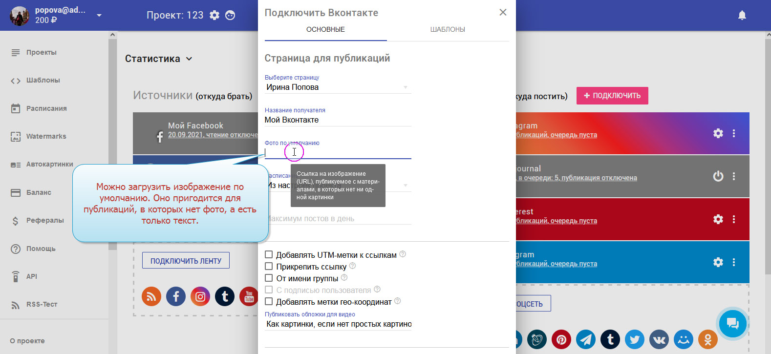 7. Можно ввести url изображения, которое будет использовано по умолчанию в публикациях без фото.