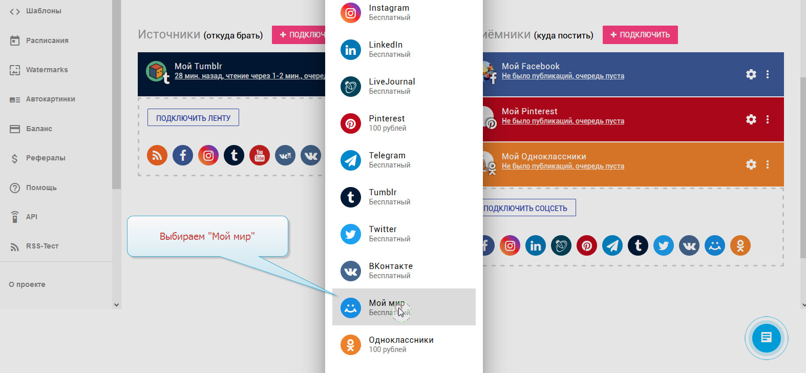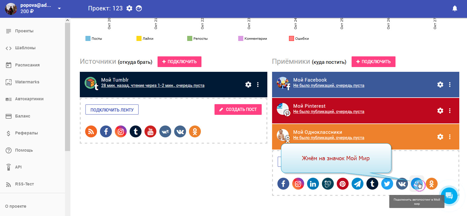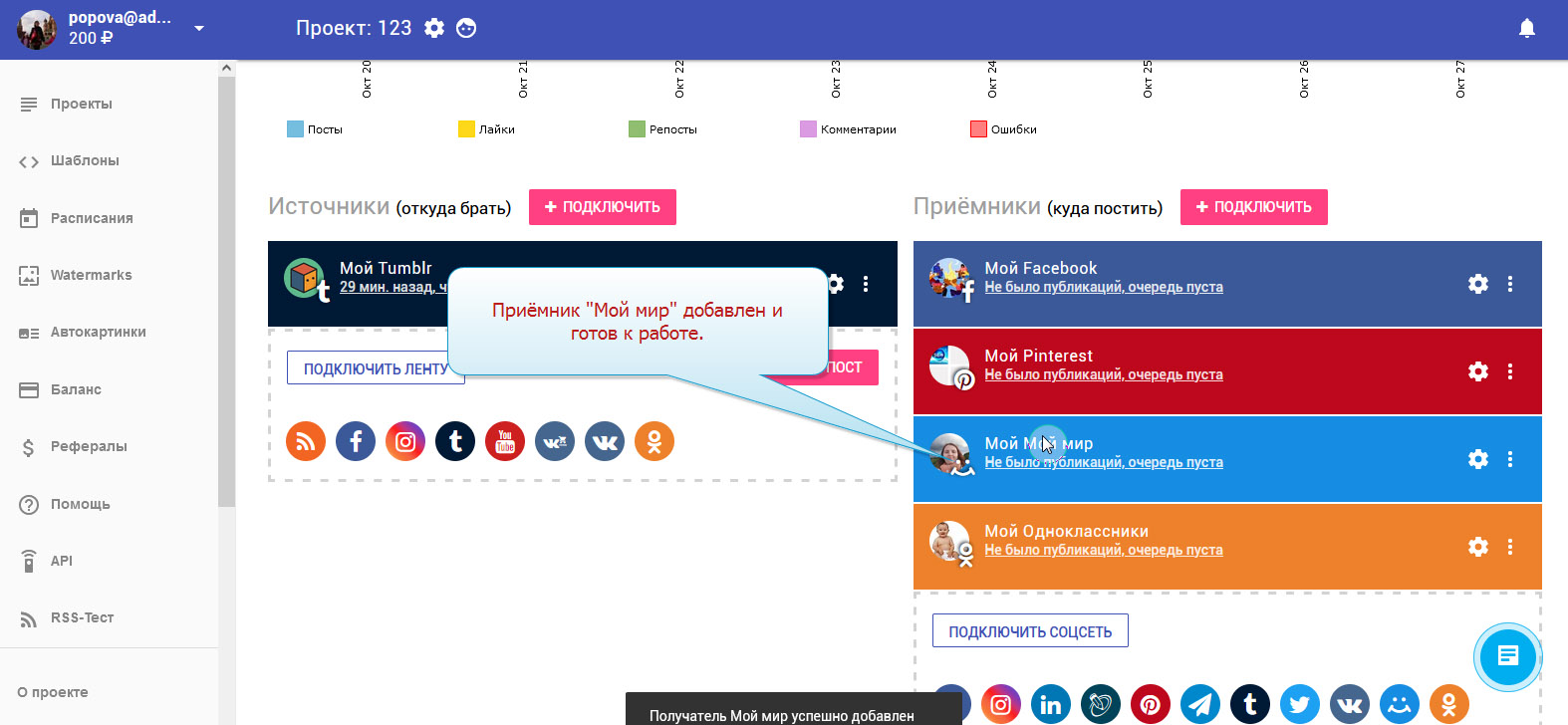13. Приёмник "Мой мир" добавлен. В колонке с приёмниками вы можете видеть свой аккаунт.