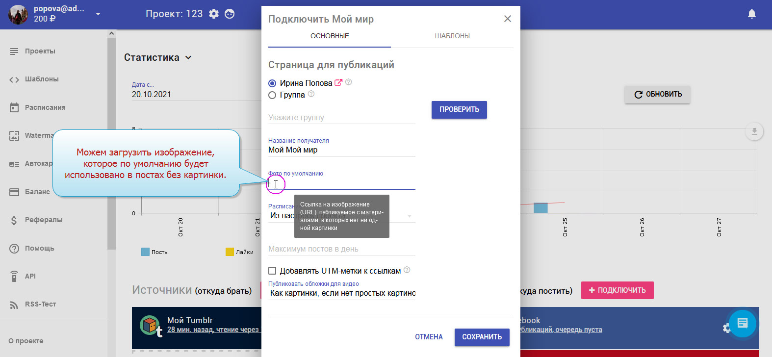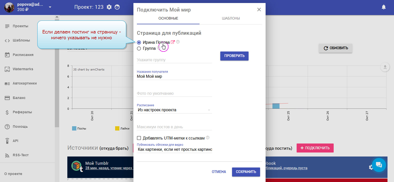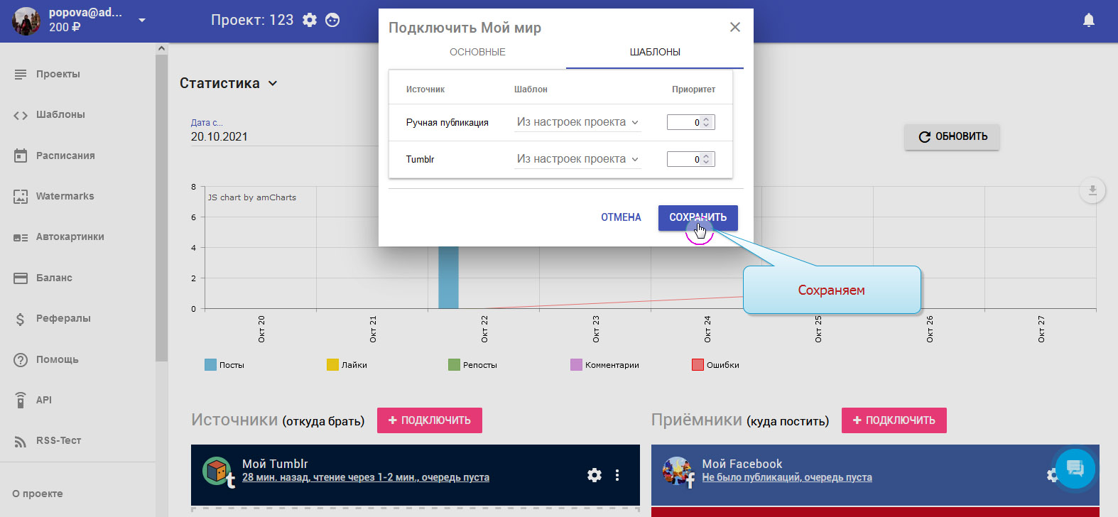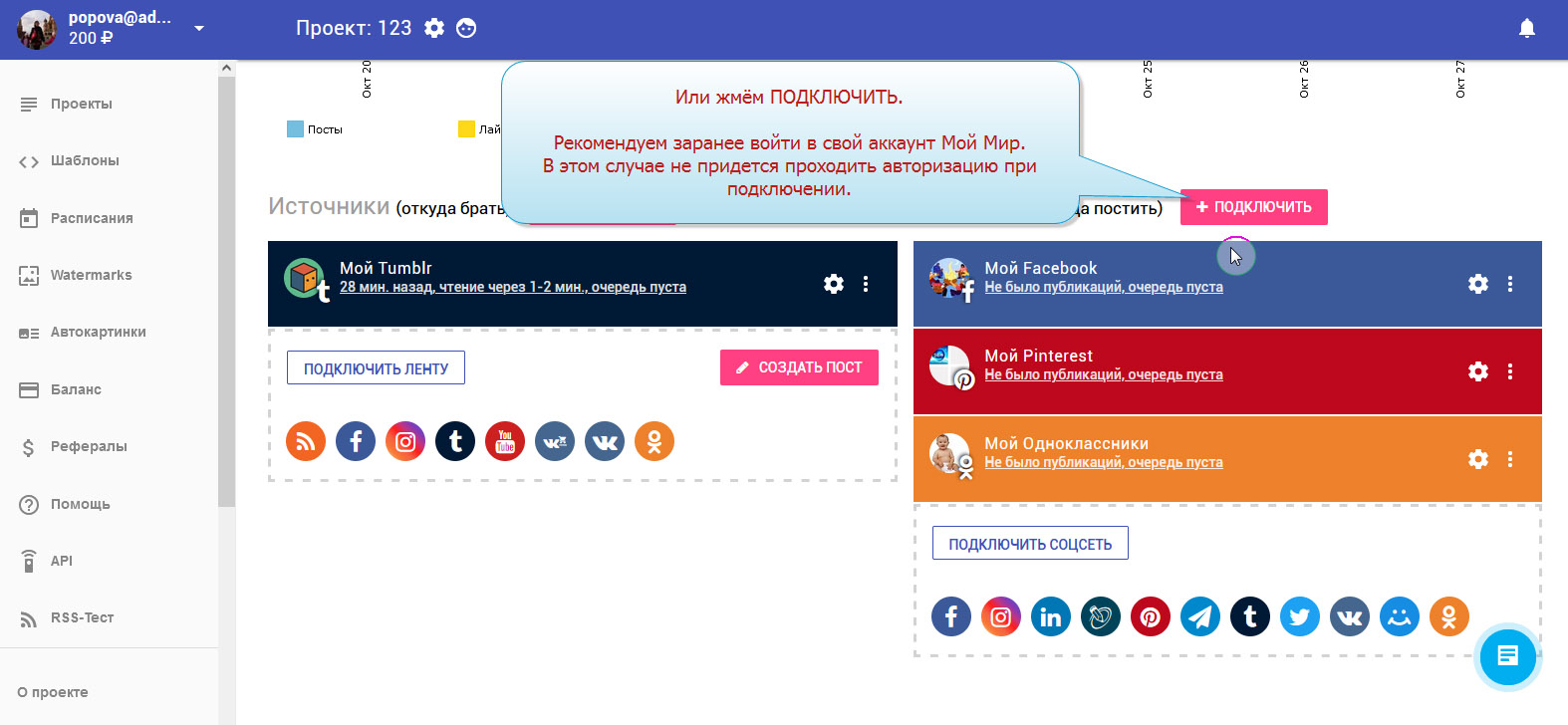 13. Приёмник "Мой мир" добавлен. В колонке с приёмниками вы можете видеть свой аккаунт.