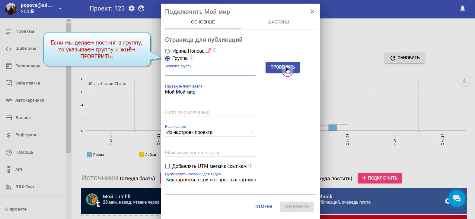 6. Если делаем постинг в группу, то указываем группу и проверяем её подключение.