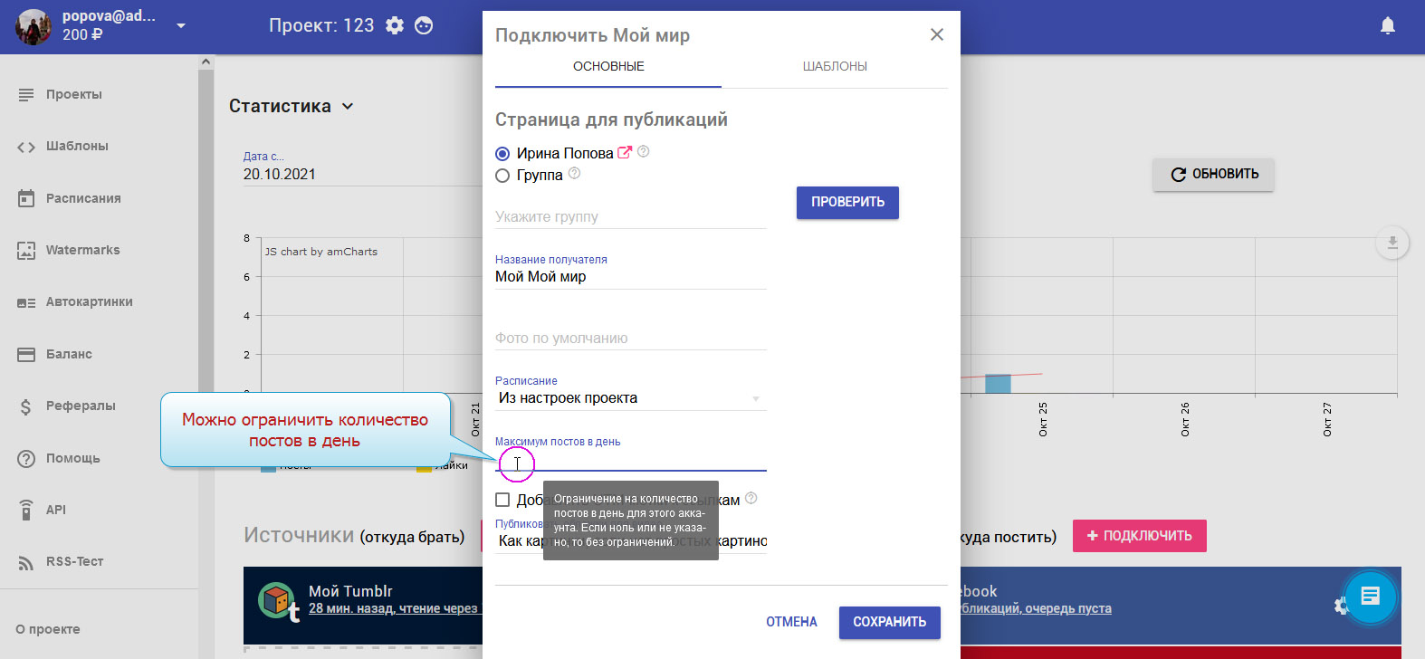 9. Можем ограничить количество публикаций в день.