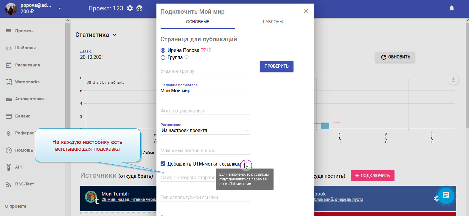 10. Есть возможность создать UTM-метки для детального анализа потока посетителей сайта (стандартный набор меток: UTM_SOURCE, UTM_MEDIUM, UTM_CAMPAIGN, UTM_TERM, UTM_CONTENT). Обратите внимание, что на каждую настройку есть своя всплывающая подсказка.