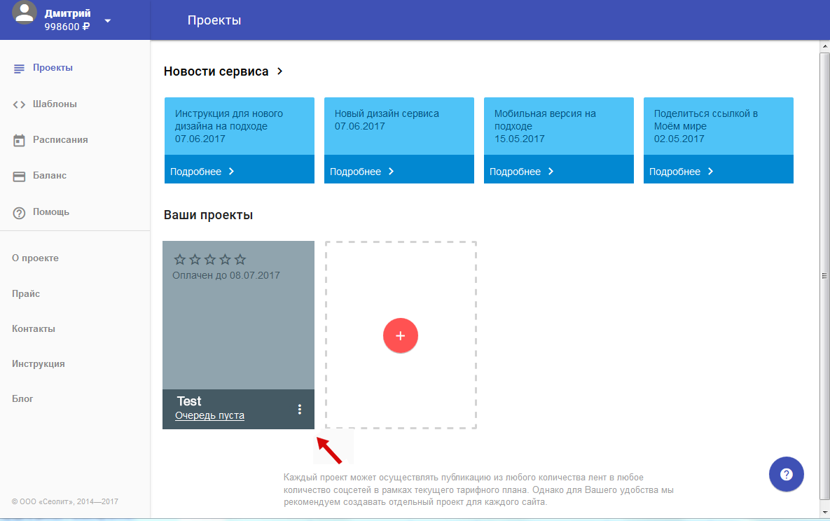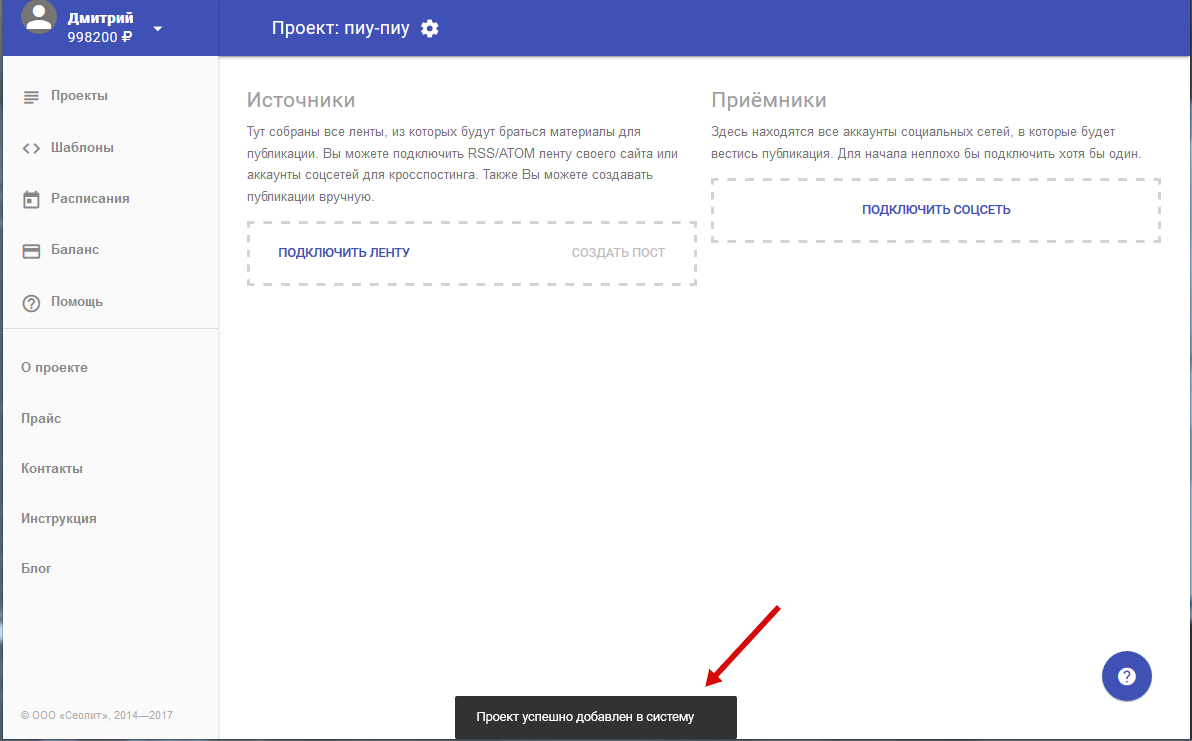 4. Ваш проект добавлен. После создания мы сразу оказываемся внутри проекта и можем добавлять аккаунты соцсетей и ленты для постингов. Увидеть его можно будет, нажав на "Проекты" в меню слева.