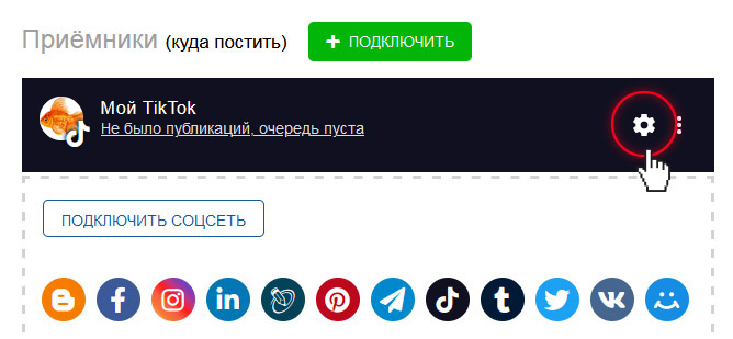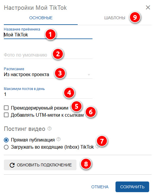 8. Если Вы меняли данные доступа к аккаунту в TikTok, или в истории публикаций обнаружились ошибки, нажмите кнопку "Обновить подключение".