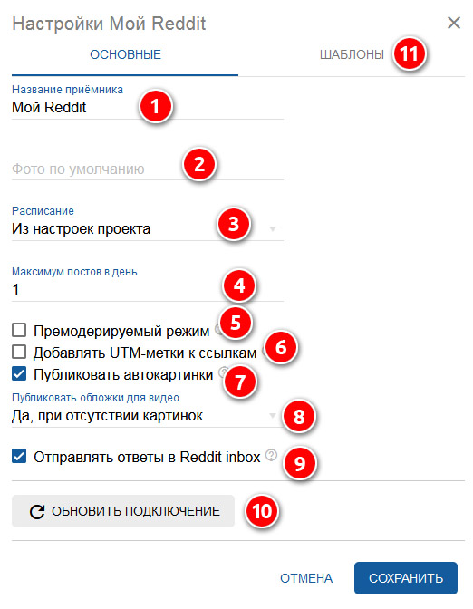 10. Если вы меняли данные доступа к аккаунту в Reddit, или в истории публикаций обнаружились ошибки, нажмите "Обновить подключение".