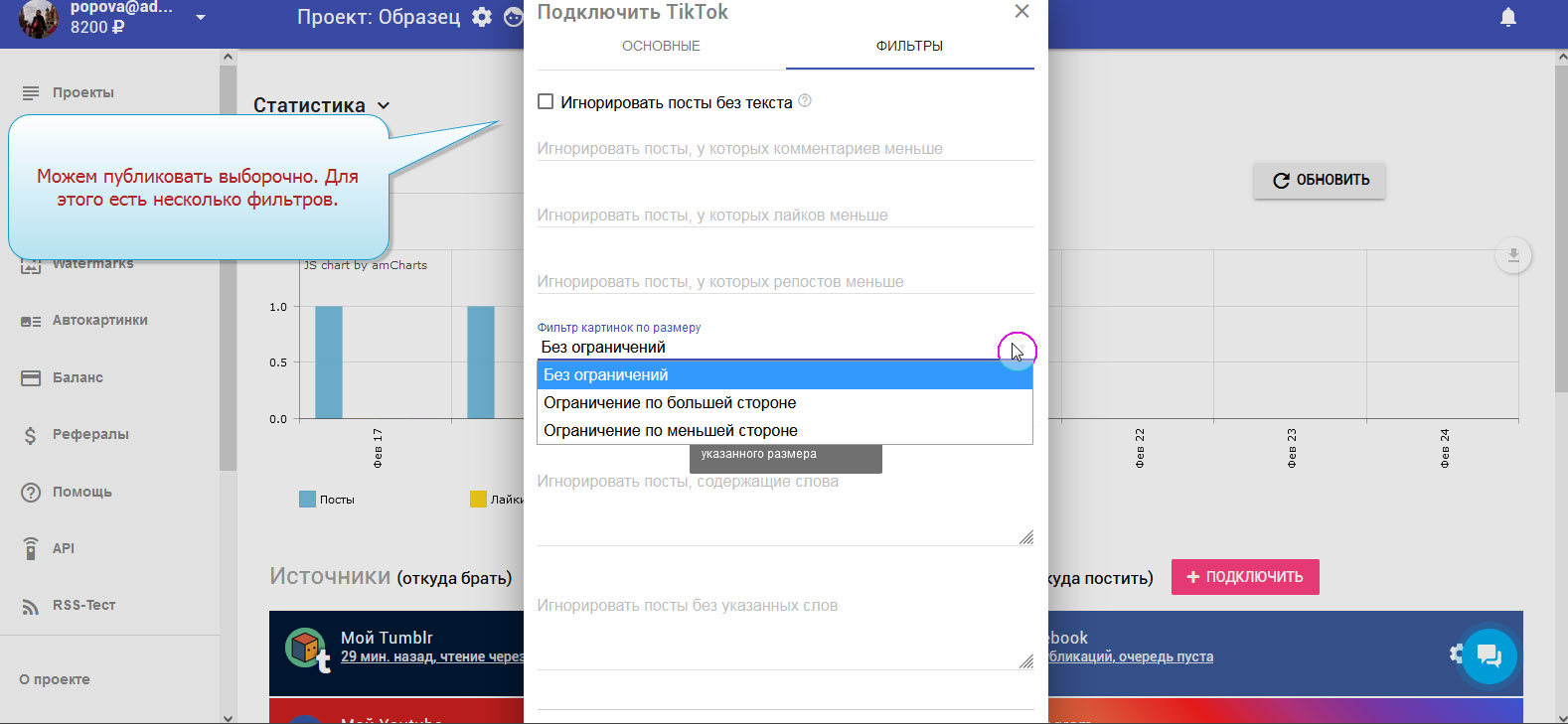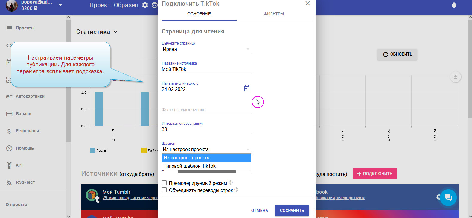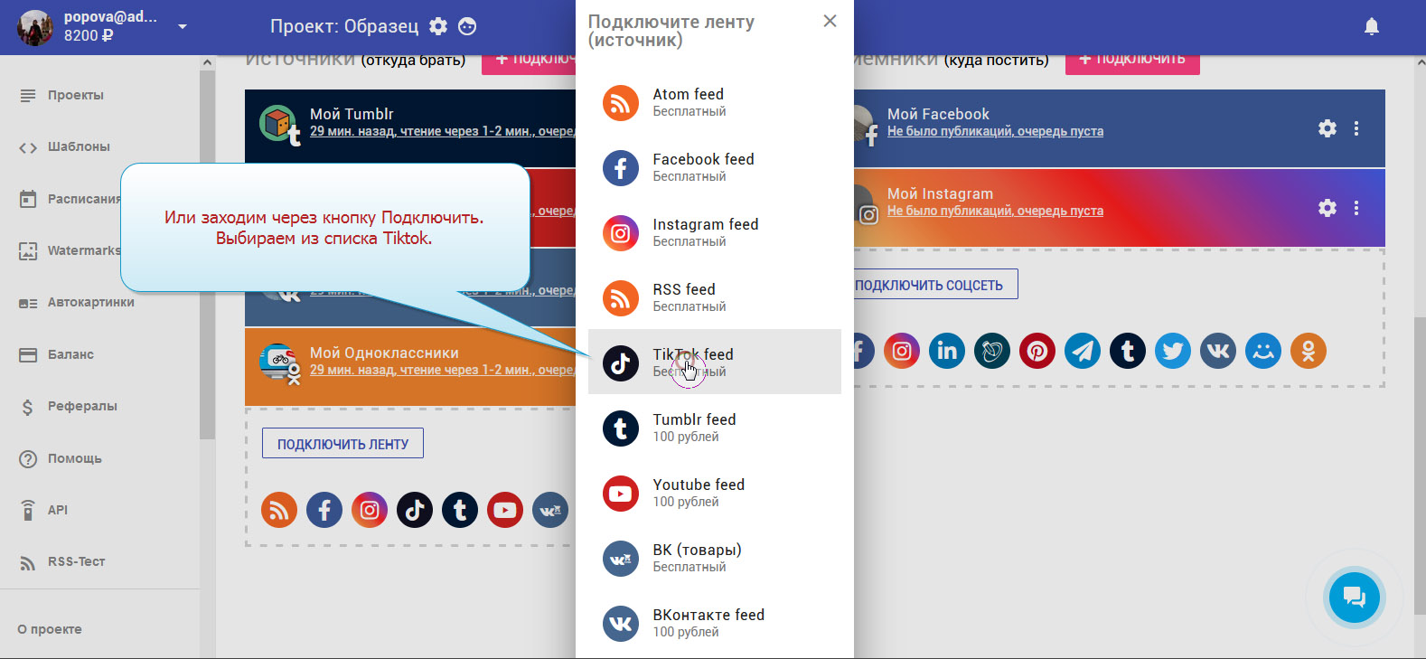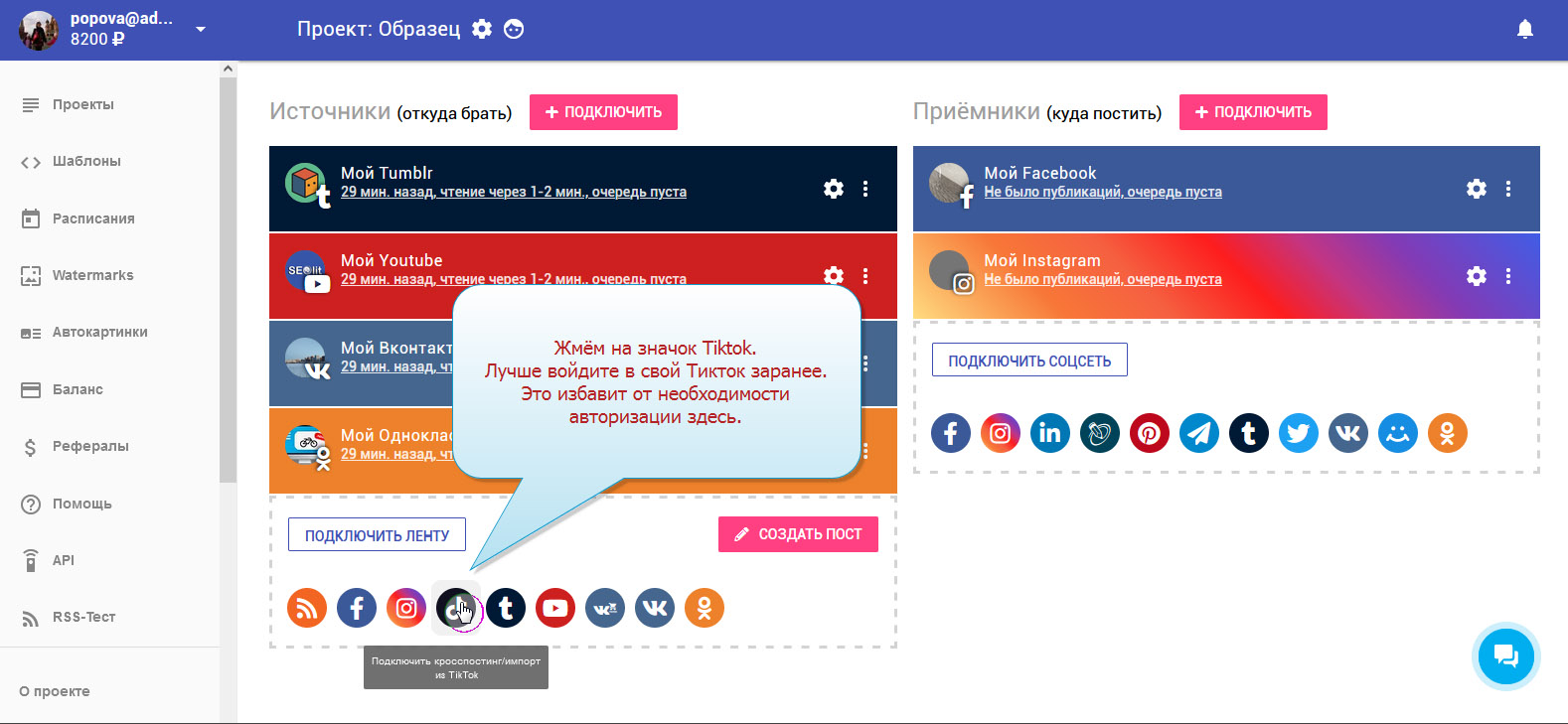 3. В колонке "Источники" нажимаем "ПОДКЛЮЧИТЬ" или просто жмём на значок TikTok. Вам будет удобнее, если Вы войдёте в свой TikTok заранее. В этом случае не надо будет проходить авторизацию здесь.
