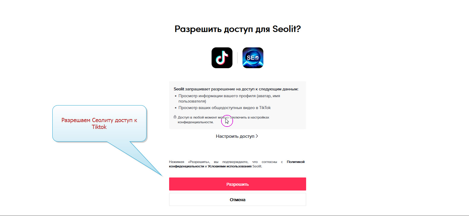 5. Разрешаем СЕОлиту работать с Вашим аккаунтом TikTok.