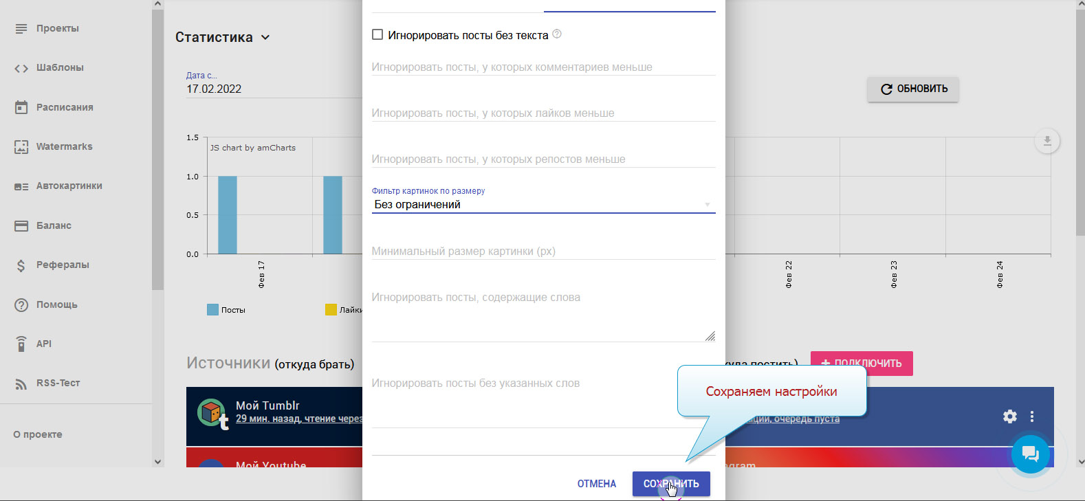 7. Настраиваем фильтрацию публикаций. Тиражироваться будут только те материалы, которые соответствуют заданным условиям.