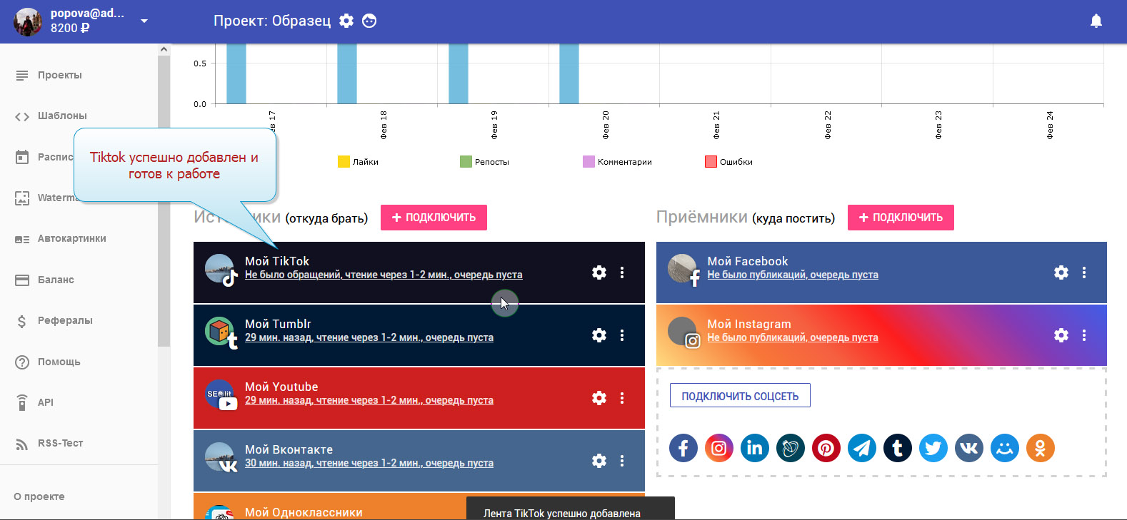 8. TikTok успешно добавлен в Источники и готов к работе.