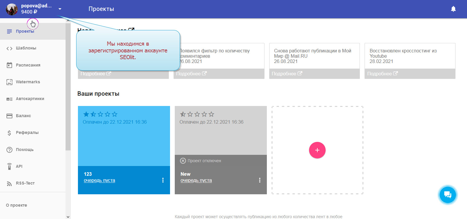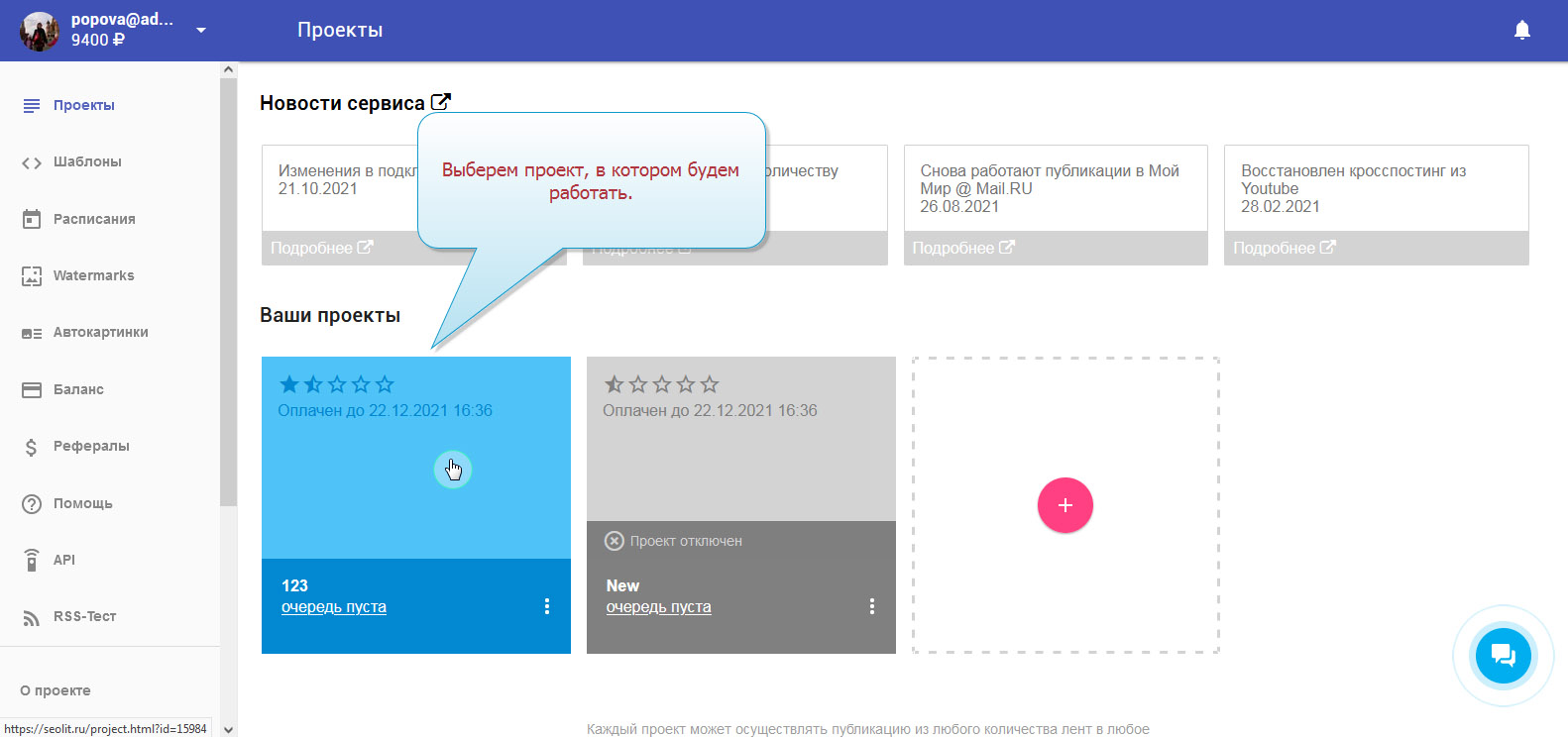 1. Вы вошли в свой профиль в Сеолите и находитесь на стадии выбора проекта.