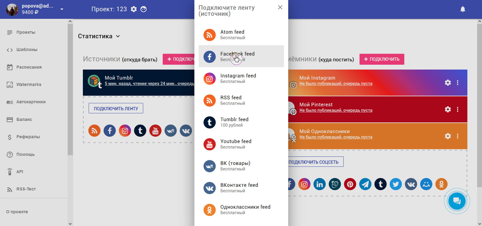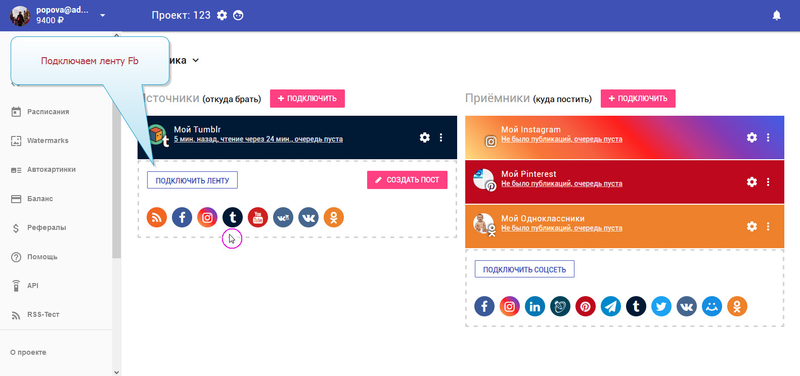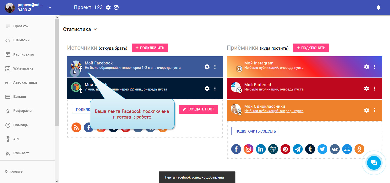 19. Лента Facebook успешно подключена и появилась в колонке "Источники".