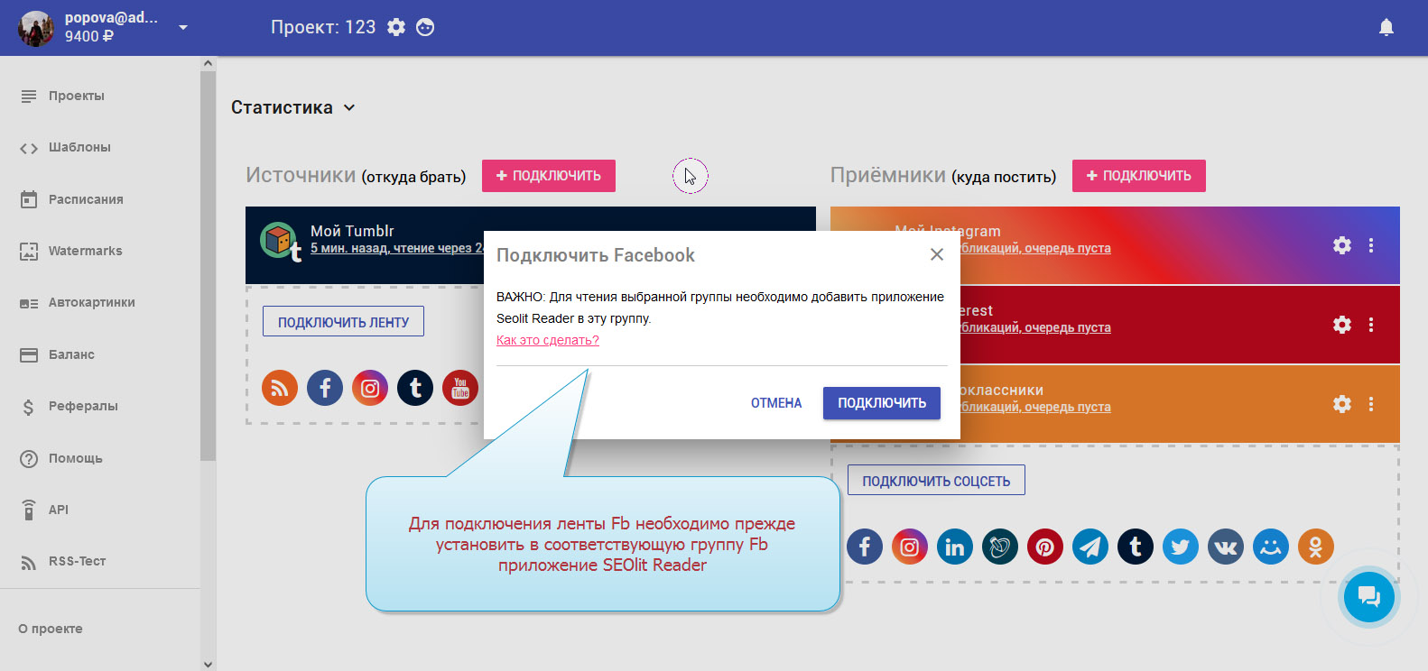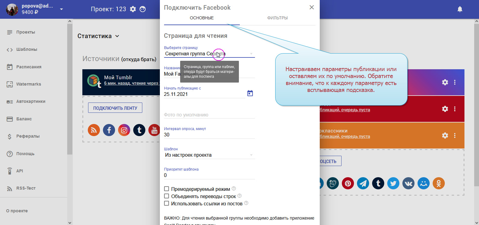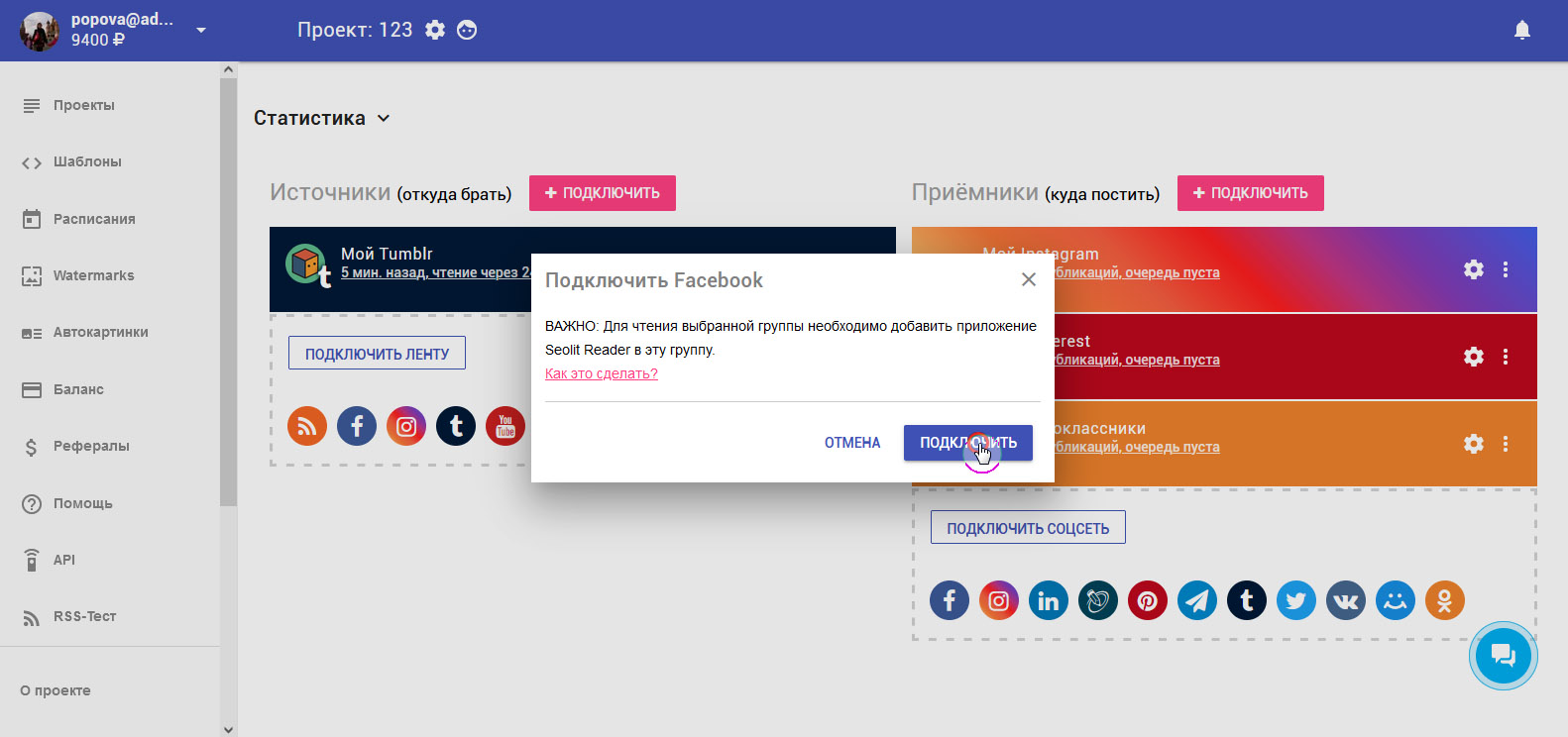 19. Лента Facebook успешно подключена и появилась в колонке "Источники".