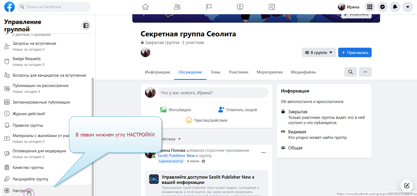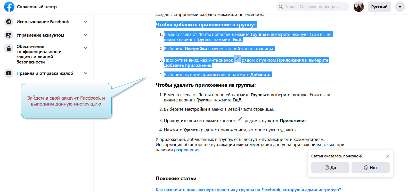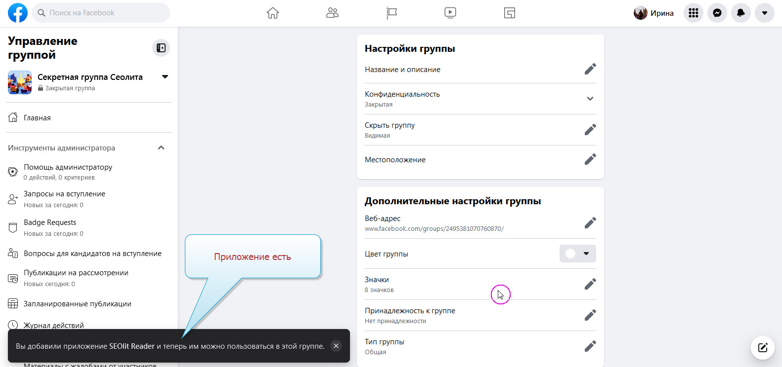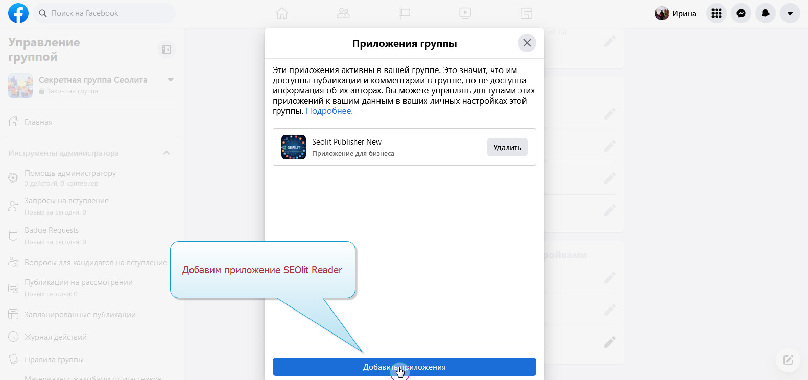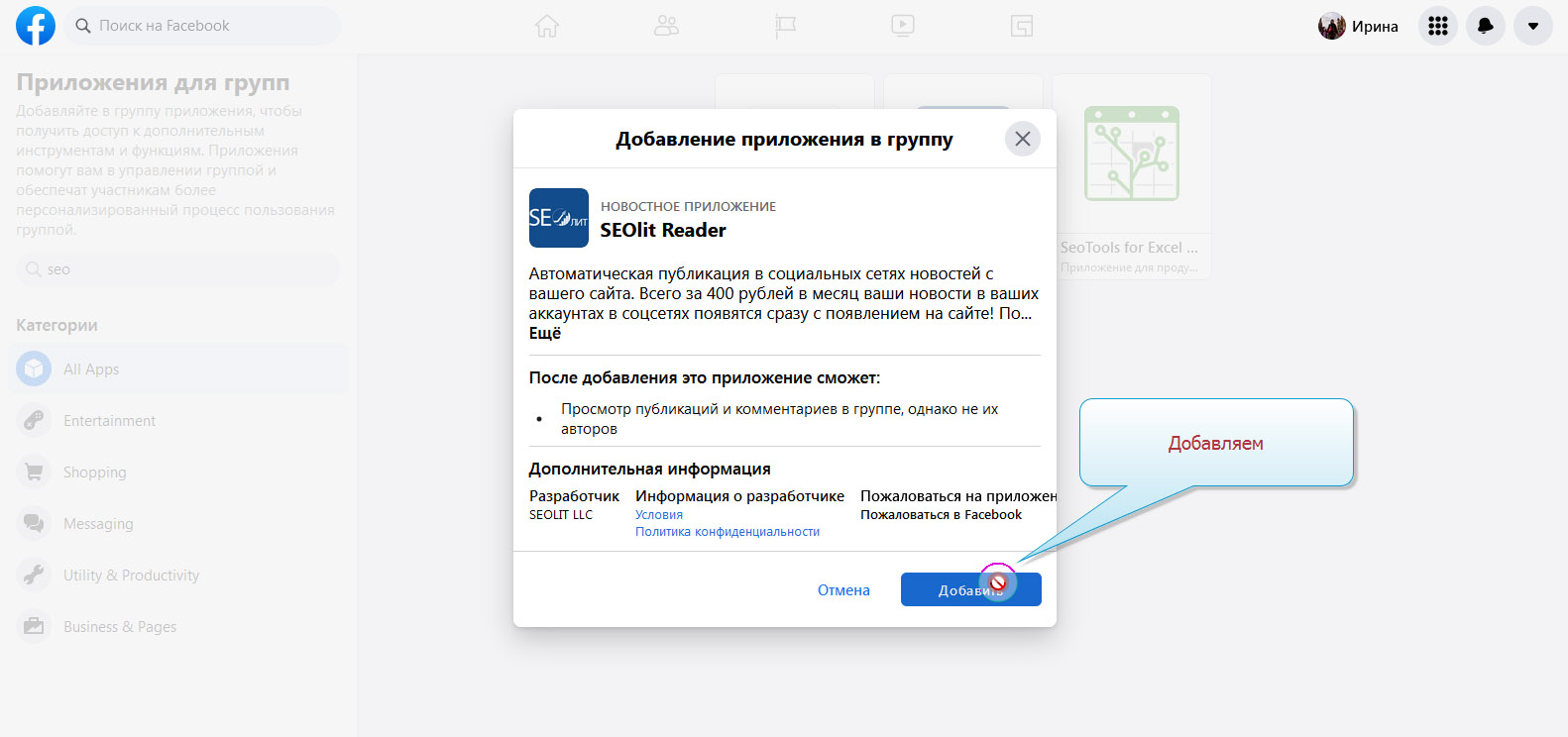 5. Для подключения ленты нам необходимо установить в группу FB приложение SEOlit Reader.