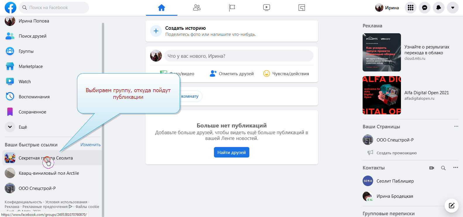 7. Заходим в свой аккаунт Facebook и выбираем группу, из которой будем публиковать.
