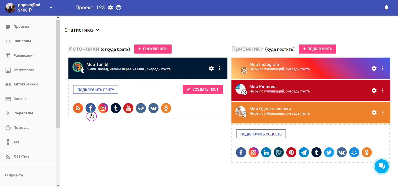Чтобы записи публиковались в соцсетях автоматически, необходимо настроить ленту "Facebook".