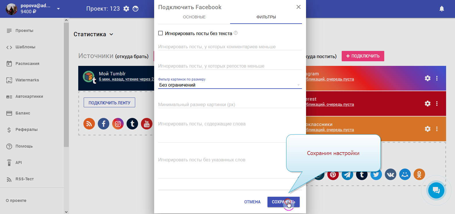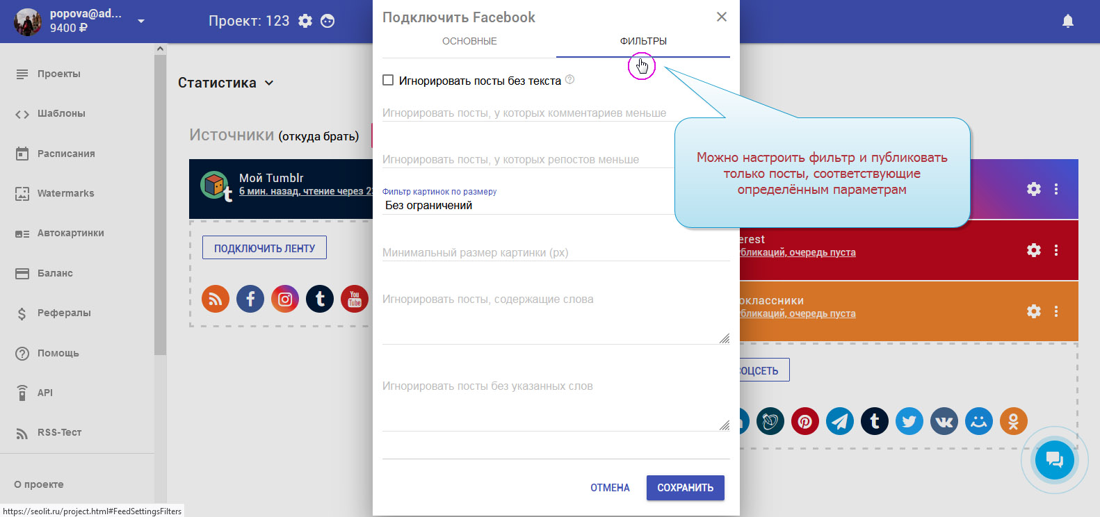 17. Можем настроить фильтрацию материалов. В автопостинг пойдут только те публикации, которые соответствуют заданным параметрам.