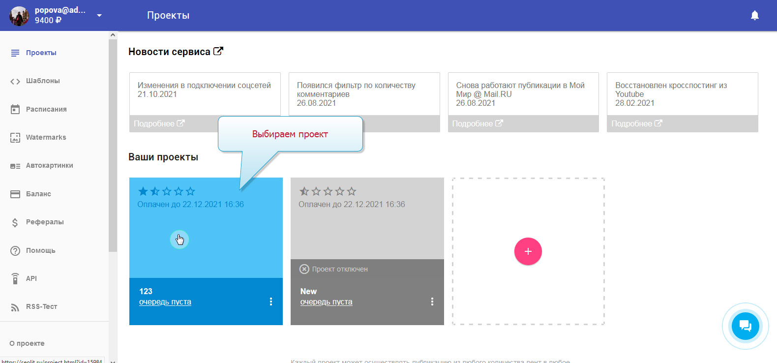 1. Вы вошли в свой профиль в Сеолите и находитесь на стадии выбора проекта.