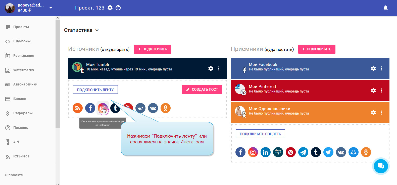 3. В колонке "Источники" нажимаем "ПОДКЛЮЧИТЬ ЛЕНТУ" или просто жмём значок Instagram.