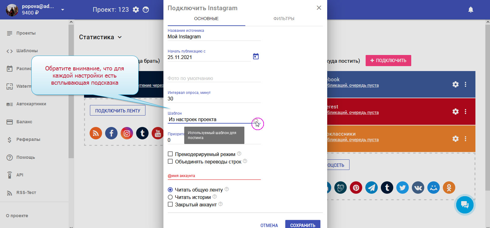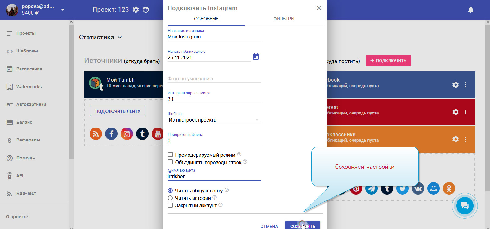 Чтобы записи публиковались в соцсетях автоматически, необходимо настроить Instagram-ленту.