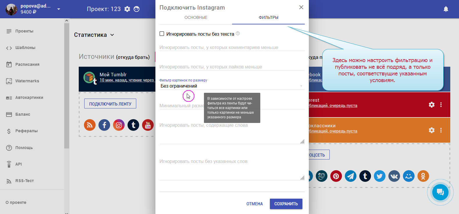 7. Есть возможность отфильтровать посты по размеру картинок и прочим параметрам.