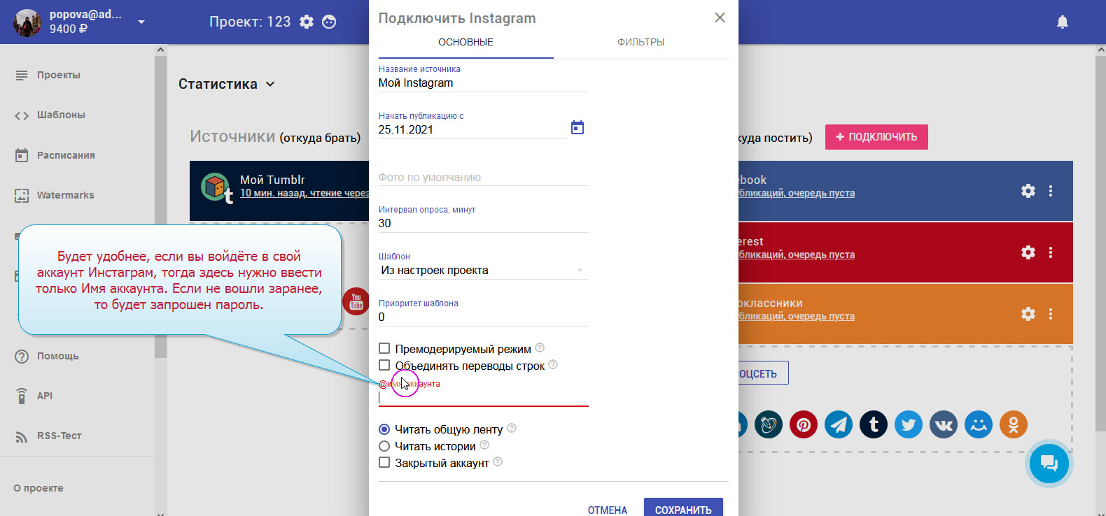 8. Указываем имя своего аккаунта Инстаграм. Будет удобнее, если Вы уже вошли в свой аккаунт заранее. Иначе появится окошко для авторизации.