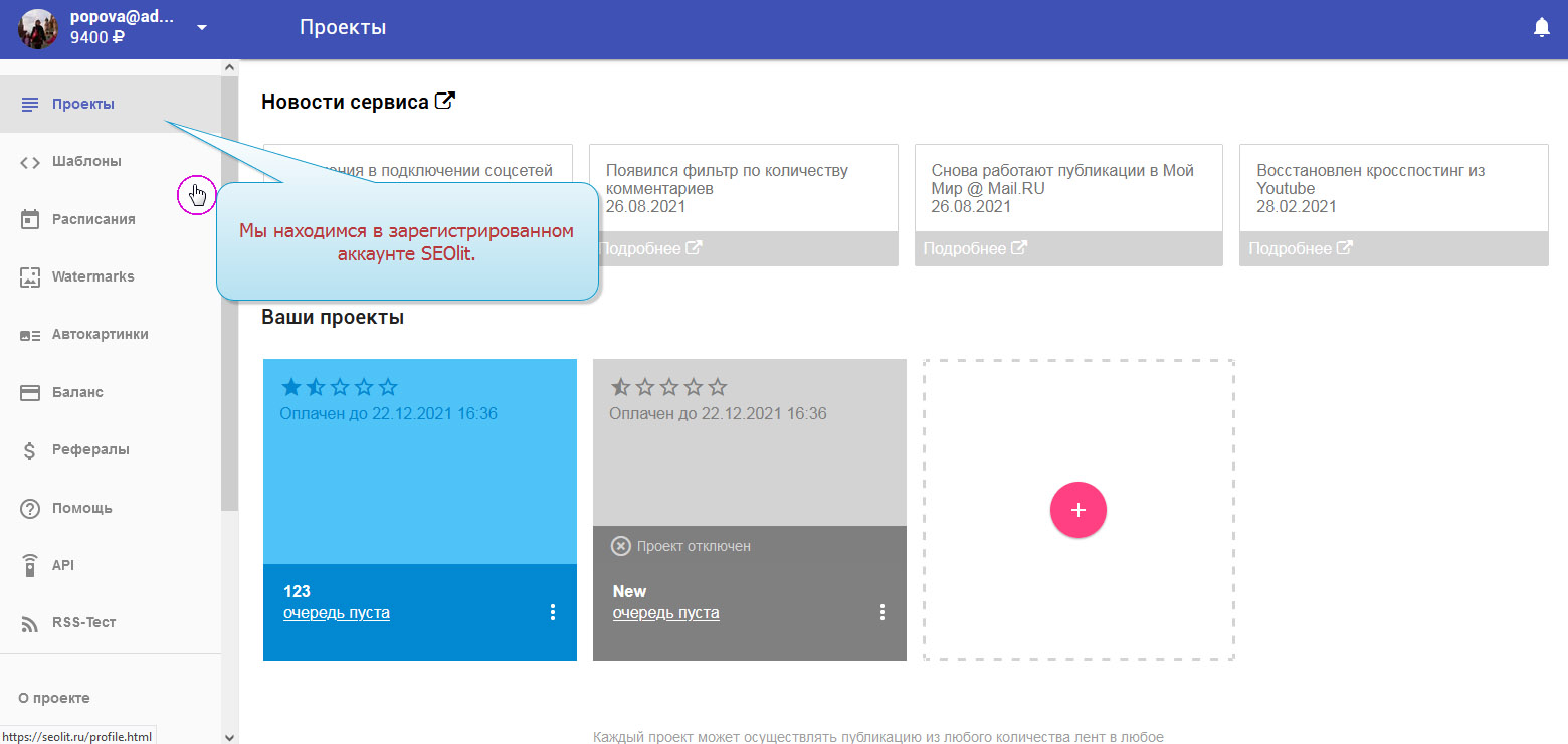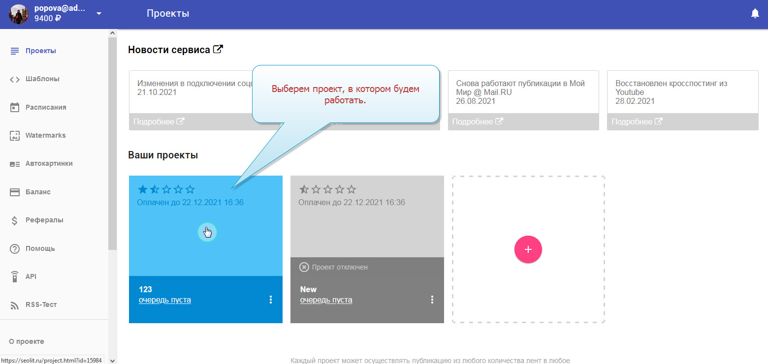1. Вы вошли в свой профиль в Сеолите и находитесь на стадии выбора проекта.