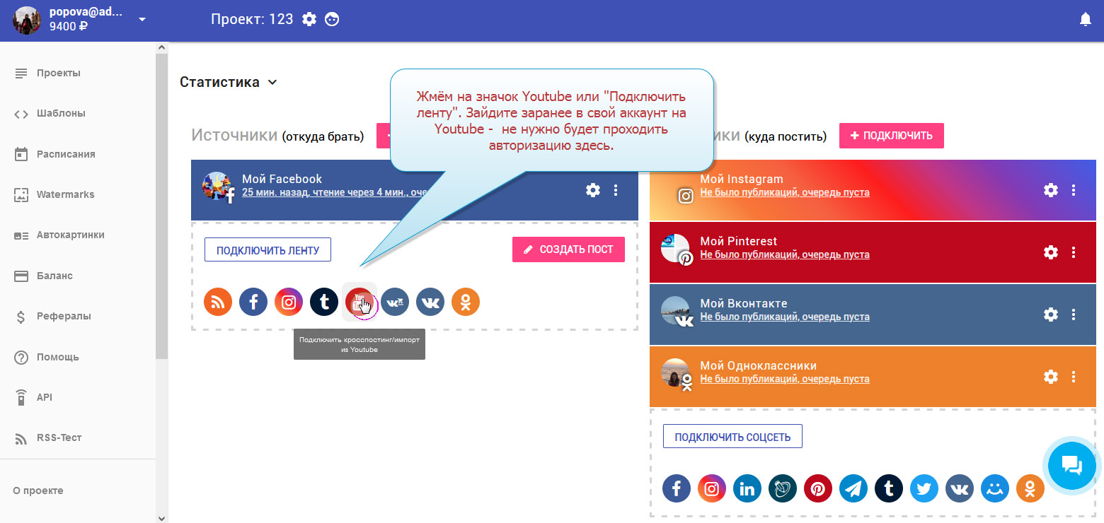 Чтобы записи публиковались в соцсетях автоматически, необходимо настроить ленту "Youtube".