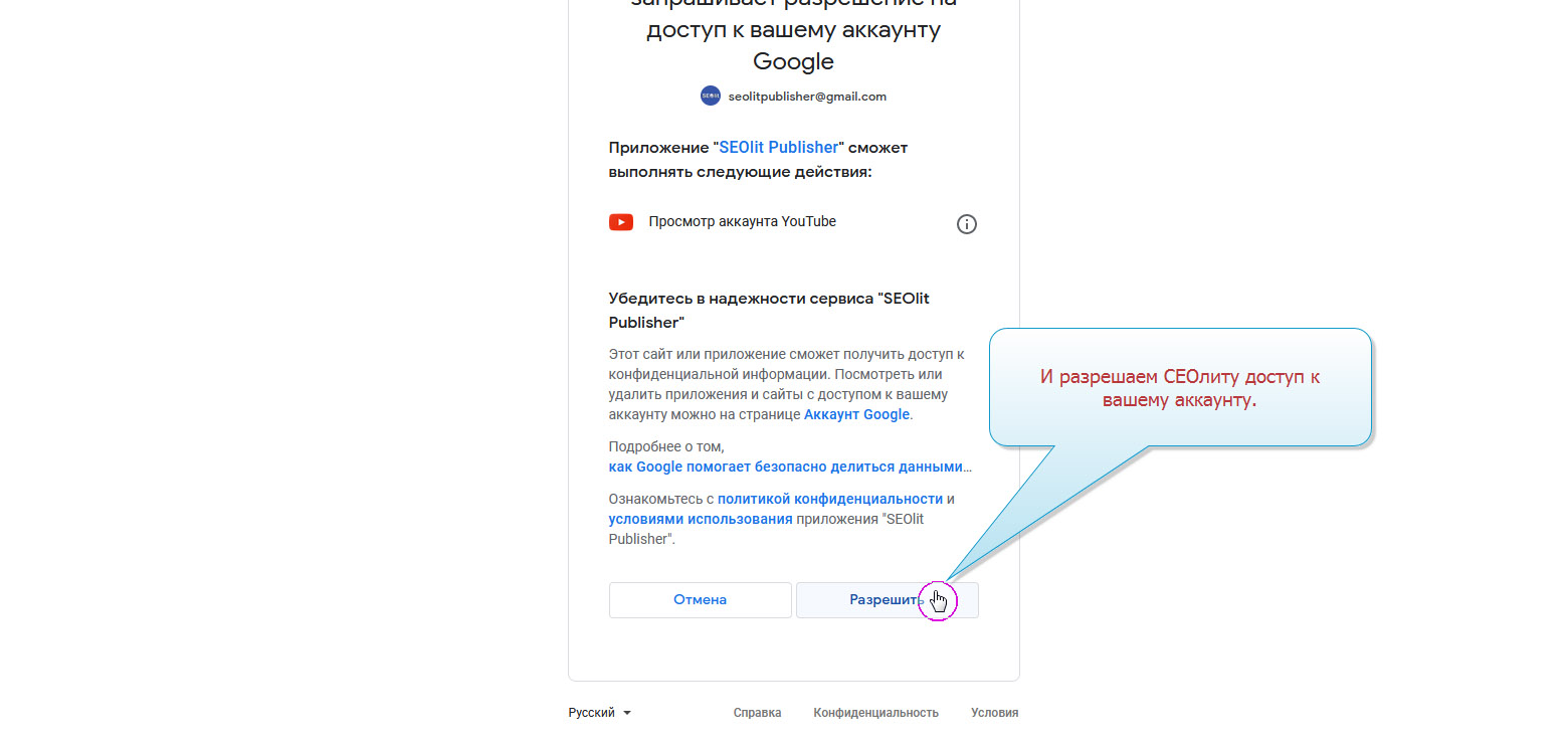 5. И разрешаем СЕОлиту доступ к своему аккаунту.