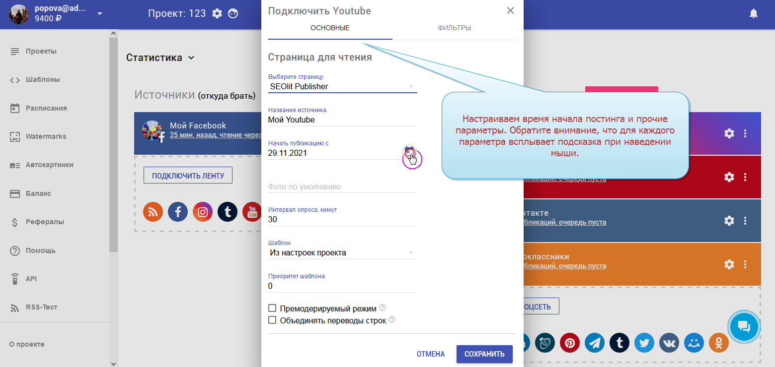 6. Настраиваем параметры публикации. Обратите внимание, что к каждому параметру всплывает подсказка при наведении мыши.