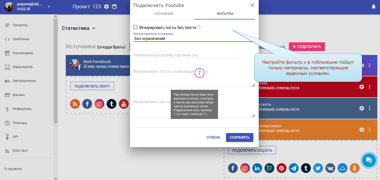 7. Можно настроить фильтры. Тиражироваться будут только посты, соответствующие заданным условиям.