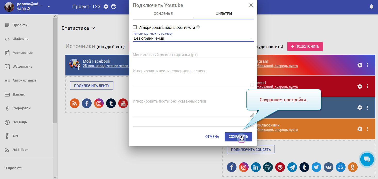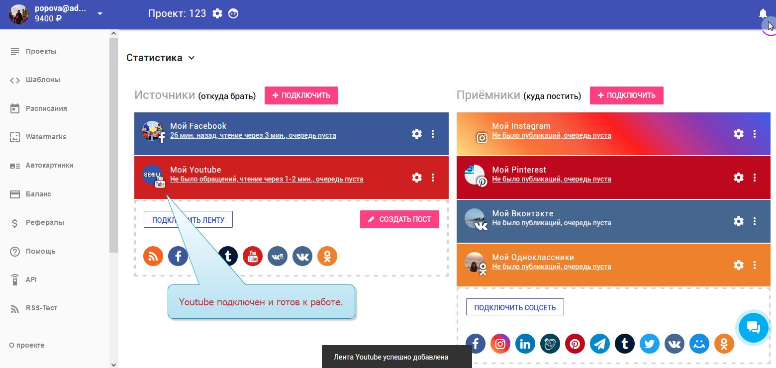 9. Добавление ленты Youtube завершено. Она появилась в колонке с Источниками.