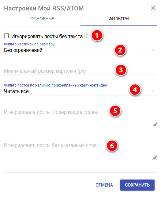 1. Этот чекбокс позволит игнорировать публикации, в которых нет текста.